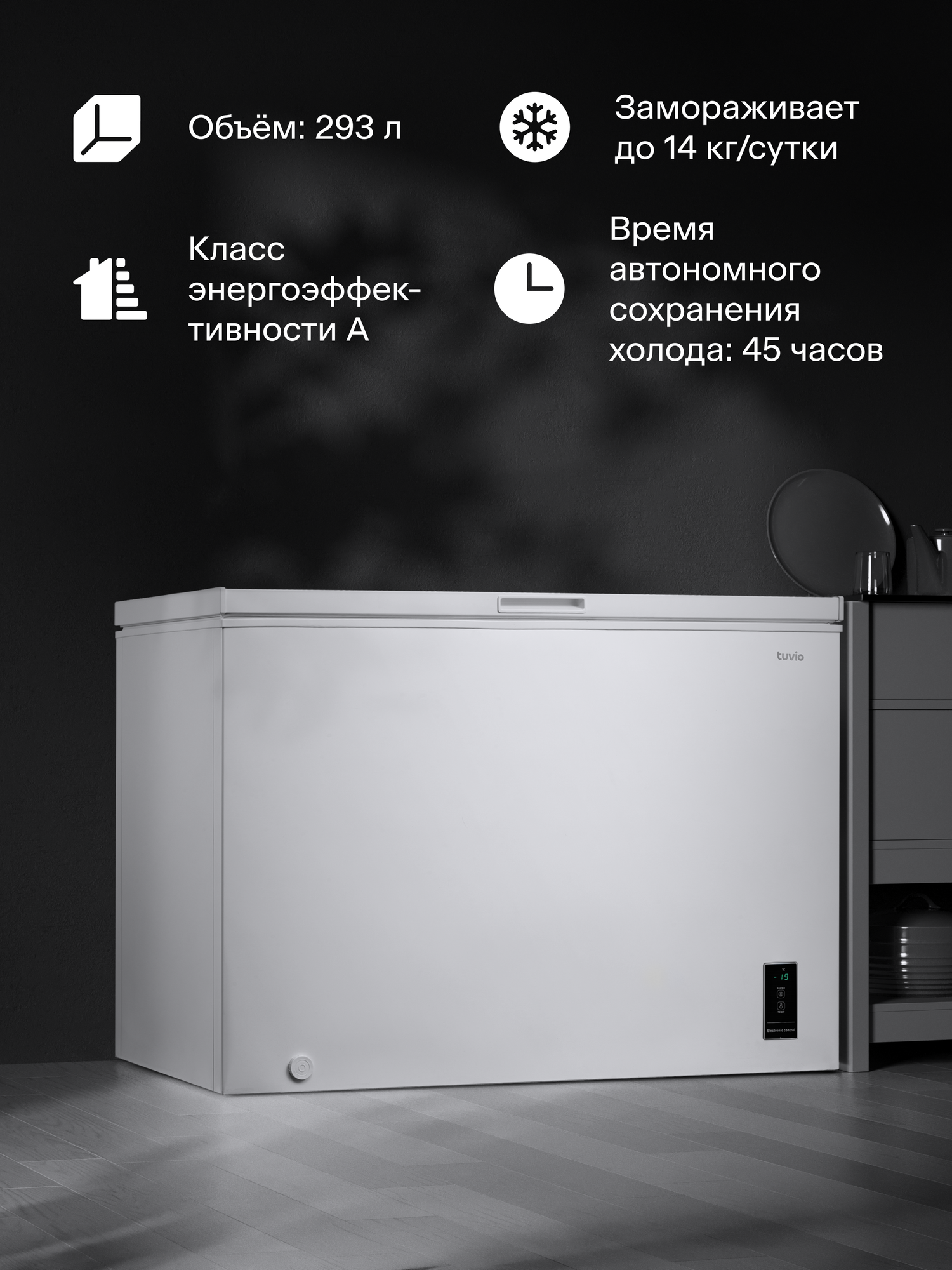 Морозильный ларь Tuvio FCS30HW1 — самая вместительная модель в линейке бренда Tuvio. Сохранит запас продуктов на большую семью. Функция быстрой заморозки поможет подготовить к длительному хранению мясо, овощи и фрукты. При необходимости ларь легко переключается в режим “Холодильник” с помощью электронного управления, а за температурой удобно следить на большом дисплее. Любители лаконичного дизайна оценят корпус модели — все решетки размещены внутри.