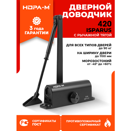 Доводчик для плавного закрывания дверей и калиток весом от 40 до 90 кг. Универсальный, морозостойкий, работает при температурах от -45 до +60 С. Скорость закрывания и скорость дохлопа регулируется индивидуально, при установке. Сертифицирован на соответствие требованиям ГОСТ. Сертифицирован для установки на противопожарные/противодымные двери. Рабочий ресурс не менее 500 000 рабочих циклов. Класс EN3-5. Регулируемая длина рычага. В комплекте 2 вида крепежа - для установки на деревянные/пластиковые двери, и для установки на металлические двери. Полноразмерный шаблон для установки с инструкцией в комплекте с каждым доводчиком. Гарантия 3 года.