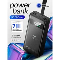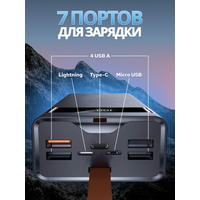 Power Bank на 50000 mAh от компании - это надежное портативное зарядное устройство нового поколения. Главное преимущество данной модели в том, что пауэр банк имеет в комплекте все популярные провода для зарядки смартфонов, планшетов и других гаджетов. С помощью быстрой зарядки вы сможете зарядить телефон на 100% без траты времени. Внешний аккумулятор может заряжать почти любую технику и гаджеты независимо от наличия розетки в ближайшей доступности. Вы больше не столкнетесь с проблемой, когда у вас разрядился смартфон, наушники или фитнесс браслет. Данный пауэрбанк для телефона многофункциональный – имеет самые распространенные встроенные порты и кабели. Оснащен 7 входами USB: 4 USB-A, Type-C, Micro USB и кабелем lightning для айфон. Аккумулятор подойдет для быстрой зарядки iPhone, Samsung, Xiaomi, Redmi, Huawei Honor, Oppo, Realmi и других моделей телефонов и планшетов. Вы сможете зарядить даже вашу видеокамеру, фотоаппарат, смарт часы и другую технику. Также Повер банк имеет 3 провода USB: Micro USB, Type-C и кабель lightning мощностью до 2.1A. Мощный аккумулятор способен одновременно обеспечивать зарядку 5 разным устройствам.
