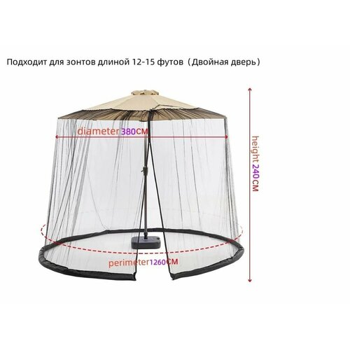 Наружный зонтичный экран обеспечивает надежную защиту внутри благодаря своей сетке, которая настолько тонкая, что ее можно сложить и положить в дорожную сумку. Москитную сетку очень удобно брать с собой в путешествие, на пикник или рыбалку. Москитная сетка для патио подходит практически для всех видов уличных зонтов, таких как настольные зонты, палубные зонты, консольные зонты, офсетные зонты и так далее. Зонтичный экран для патио - практичный и необходимый инструмент летом для активного отдыха. Размер:380 * 240 см (может использоваться для зонтиков для патио диаметром 12-15 футов.) Окружность 1260 см используется в: зонтике-банане или римском зонтике диаметром 380 см. Измерьте, соответствует ли размер зонта стандарту: если окружность москитной сетки больше или равна окружности зонта, то эта москитная сетка подходит именно вам.