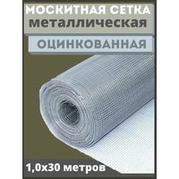 Москитная сетка антикошка из оцинкованной стали в рулоне 1,0х30м. Оцинкованная металлическая москитная сетка производится из малоуглеродистой стали методом полотняного переплетения, после чего подвергается оцинковки (небольшой толщины). Оцинкованная москитная сетка обладает высокой прочностью и немалой устойчивостью к коррозии, кроме этого имеет большой срок службы. По этой причине функции такой сетки более широки: она может выдержать вес домашней кошки и не допустить ее падения из окна, а также частично защитить жилище от проникновения злоумышленников, ведь снять или разрезать данное приспособление не так просто. Со временем в уязвимых местах может подвергаться коррозии из-за небольшой толщины оцинковки. Применяется в основном для защиты от насекомых в частных домах, для защиты окон и входных дверей.