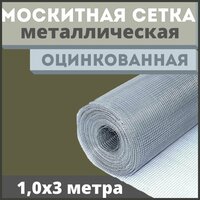 Москитная сетка антикошка из оцинкованной стали в рулоне 1,0х3м. Оцинкованная металлическая москитная сетка производится из малоуглеродистой стали методом полотняного переплетения, после чего подвергается оцинковки (небольшой толщины). Оцинкованная москитная сетка обладает высокой прочностью и немалой устойчивостью к коррозии, кроме этого имеет большой срок службы. По этой причине функции такой сетки более широки: она может выдержать вес домашней кошки и не допустить ее падения из окна, а также частично защитить жилище от проникновения злоумышленников, ведь снять или разрезать данное приспособление не так просто. Со временем в уязвимых местах может подвергаться коррозии из-за небольшой толщины оцинковки. Применяется в основном для защиты от насекомых в частных домах, для защиты окон и входных дверей.