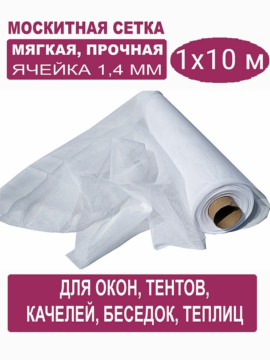 Мягкая и прочная полиэфирная белая москитная сетка 1 х 10 м используется для защиты от летающих насекомых при изготовлении и ремонте садовых шатров, тентов, качелей.