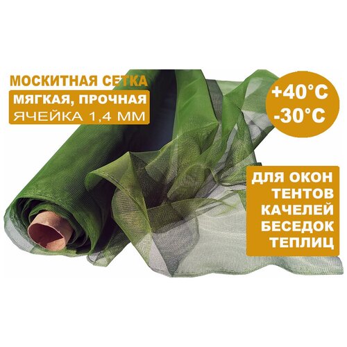 Мягкая и прочная полиэфирная темно-зеленая москитная сетка в рулоне 1,5 х 25 м используется для защиты от летающих насекомых при изготовлении и ремонте садовых шатров, тентов, качелей.