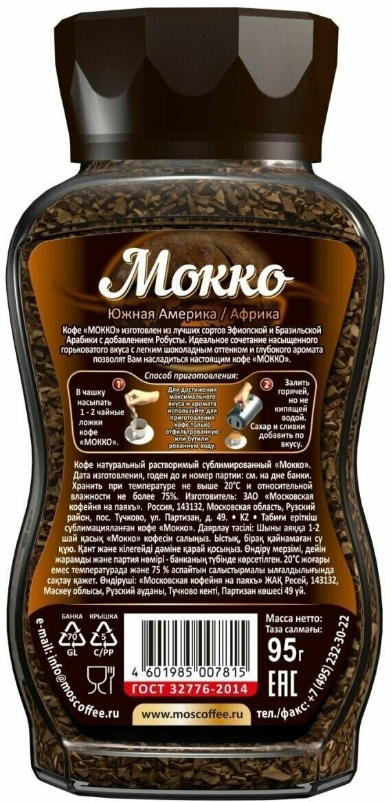 В составе кофе Московская кофейня на паяхъ Мокко используются только отборные кофейные зерна Арабики и Африканская Робуста. Эти компоненты обеспечивают богатый и глубокий аромат, который делает каждую чашку кофе особенной.