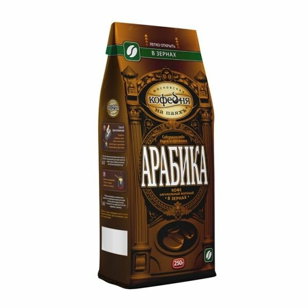 Кофе натуральный жареный в зернах Московская кофейня на паяхъ Арабика. Приготовлен исключительно из премиальных сортов Арабики. Традиционная обжарка придает насыщенный мягкий вкус с приятной кислинкой и чистый натуральный аромат настоящего кофе. Специальный клапан на пакете гарантирует сохранение вкуса и аромата свежеобжаренного кофе.