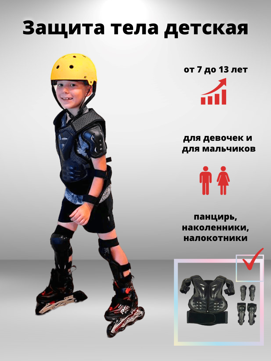 Экипировка детская - это необходимая защита тела при занятиях спортом. Отлично защищает при езде на роликах. Набор мотоэкипировки для малышей и подростков включает в себя: защита груди и спины, защита плеч, защита локтей и коленей. Комплект содержит всё необходимое для безопасной и комфортной езды на мотоцикле, питбайке, квадроцикле, самокате или велосипеде. 1. Прочная моточерепаха, с полной защитой спереди и сзади, а так же плеч. Грудь и спина защищены специальными протекторами, которые имеют хорошую гибкость и вентиляцию, что обеспечивает комфорт спортсмена при любых погодных условиях. Плечи крепятся к панцирю и оснащены защитными вставками. Мото вело защита для мальчиков/для девочек изготовлена из дышащего материала и оснащена специальными липучками и регулируемыми ремешками, что обеспечивает свободу движения и универсальность в носке. Регулировка размера на рост от 120-150см. и на возраст от 7 до 13 лет. за счет специальных ремешков и свободной модели. Моточерепаха подойдет для зимних занятий сноубордом, лыжами, коньками. Куртка для мотоциклиста изготовлена из синтетической прочной ткани на которой расположены защитные щитки. Вставки изготовлены из ударопрочного ABS - пластика, внутри со вспененным материалом и сетками вентиляции. Используя такую экипировку вы практически исключаете травмы груди, локтей, коленей. При падении на максимальной скорости и последующим скольжении по дороге, водитель обеспечен максимальной защитой. Даже при сильном ударе, вы можете быть уверены, что защита не расколется, а значит вы не получите ранение осколками. Куртка застегивается на молнию спереди и фиксируется широким эластичным поясом на липучке. Вся защита хорошо продувается, а значит даже в +30 спортсмену будет комфортно. Мотокуртка для спорта подходит для любой погоды: от -30 до +30 градусов. Велозащита представлена в полностью черном цвете или с оранжевыми вставками. Оба варианта очень стильные и будут отлично сочетаться с другой экипировкой. 2. Наколенники 2 шт. Защита колен и голени. 3. Налокотники 2 шт. Защита локтей. Локти и колени универсальны - размер регулируется с помощью эластичных застежек на липучке. Все элементы набора можно использовать отдельно, как внутрь спортивной экипировки, так и снаружи.