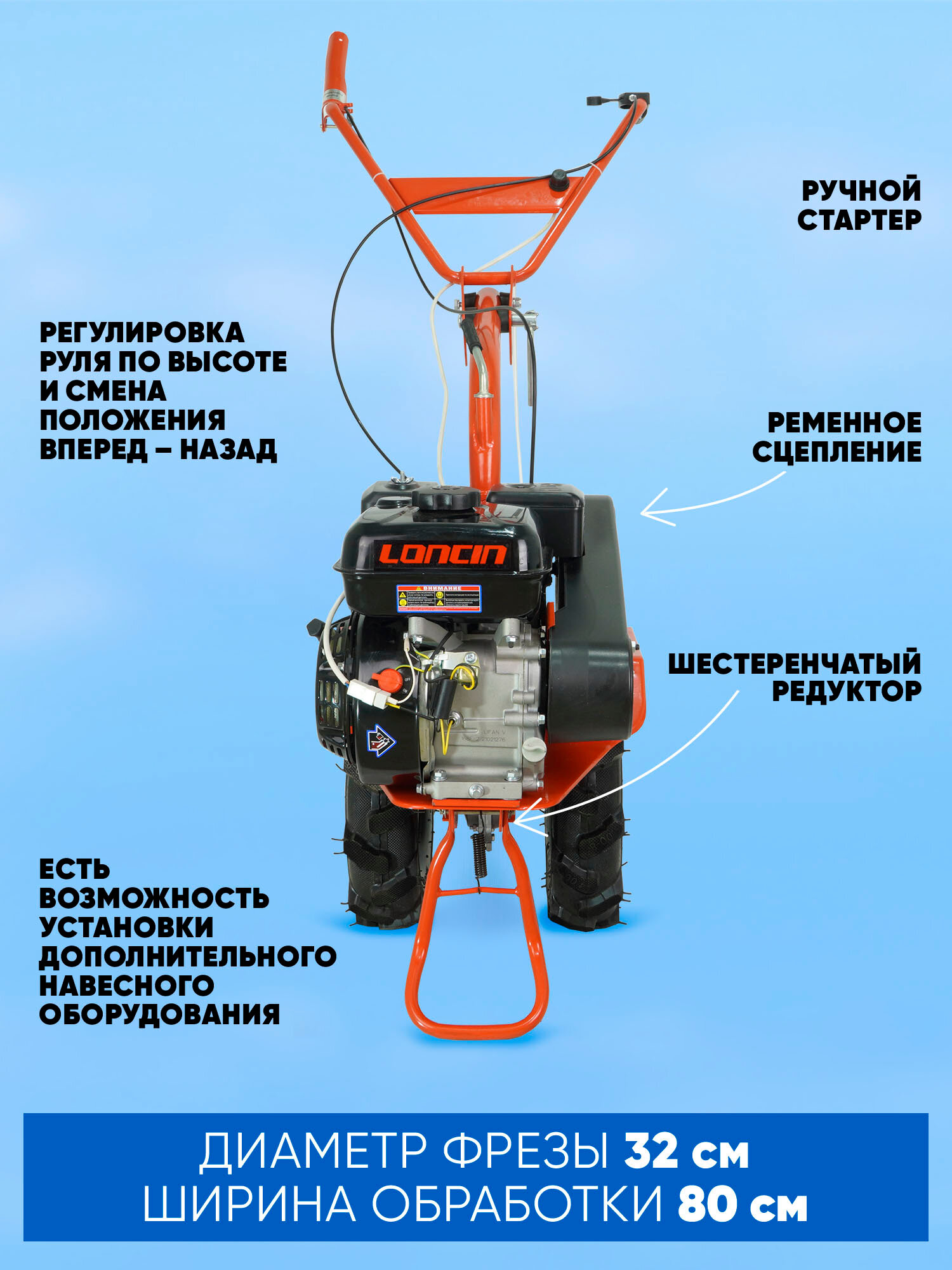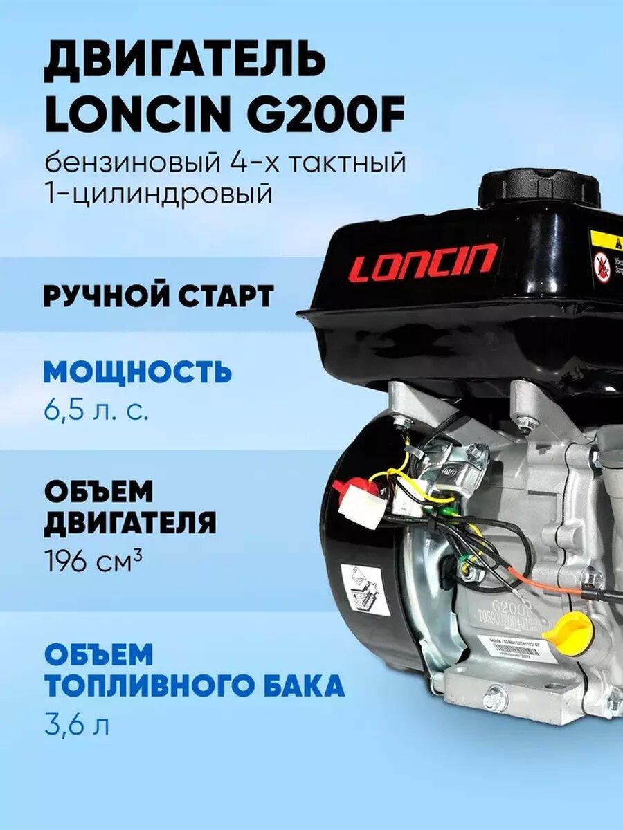 В качестве силового агрегата на мотоблоке используется четырехтактный бензиновый двигатель Loncin G200F с мощностью 6,5 л. с. Надёжный двигатель обеспечивает бесперебойную работу при интенсивном использовании, а установленный датчик уровня масла предотвращает повреждение двигателя при понижении уровня масла в картере ниже необходимого.