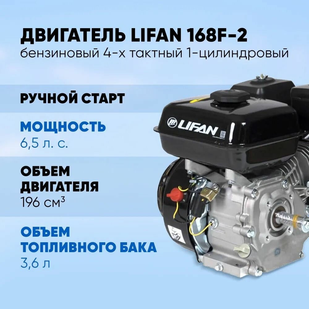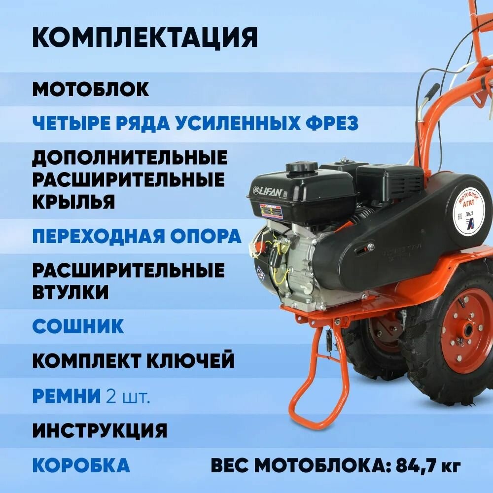 Особенности:- двигатель Lifan 168F-2 мощностью 6.5 л. с. - низкий центр тяжести со смещением вперед - облегчает работу на огороде. С таким центром тяжести Агат Л-6,5 устойчив к опрокидыванию и не заваливается во время культивации- переключение передач посредством рычага, расположенного на корпусе редуктора- рулевая колонка регулируется по высоте- простое управление - шестеренчатый редуктор с клиноременной передачей не имеет сложностей в обслуживании- можно использовать до шести рядов фрез. По три с каждой стороны. Это увеличивает ширину захвата до 800 мм- рукоять сцепления с фиксатором избавляет от необходимости подолгу удерживать её в нажатом состоянии - оснащён профессиональной коробкой передач механического типа, которая позволяет выбрать оптимальный режим работы в зависимости от нагрузки. Коробка обеспечивает переключение в диапазоне 2 скоростей вперед и 1 назад. При перестановке ремня на шкиве можно изменить передаточное число, тем самым изменив скорость движения. Возможных вариантов скоростей: до 4 вперед и 2 назад - многофункциональный агрегат, к которому подходит большое количество навесного оборудования