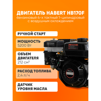В качестве силового агрегата на мотоблоке используется четырехтактный бензиновый двигатель Habert HB170F с мощностью 7 л. с. Надёжный двигатель обеспечивает бесперебойную работу при интенсивном использовании, а установленный датчик уровня масла предотвращает повреждение двигателя при понижении уровня масла в картере ниже необходимого. Применяемый на двигателе воздушный фильтр с масляной ванной даёт лучшую фильтрацию воздушного потока, что благоприятно сказывается на ресурсе двигателя.