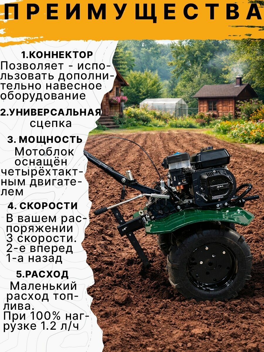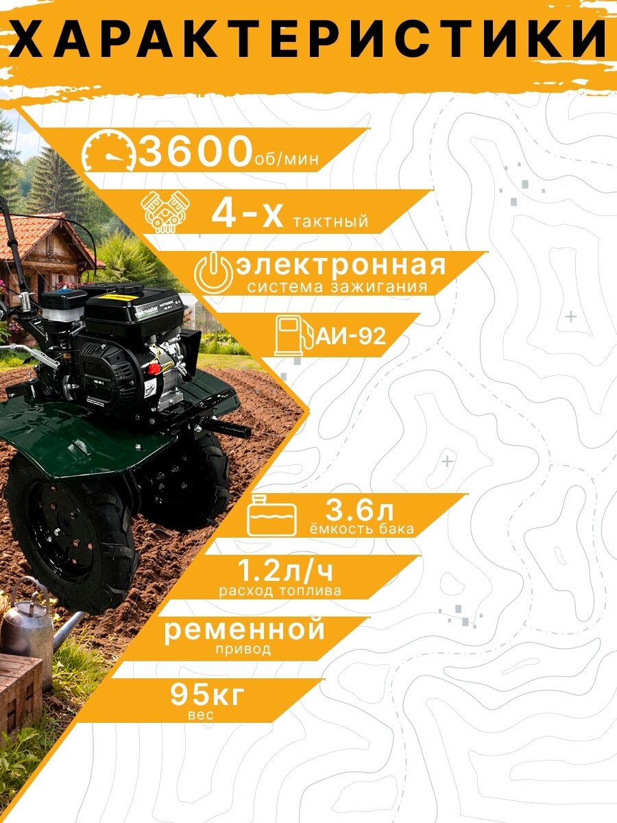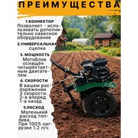 | Комплект поставки | Рукоятка управления дроссельной заслонкой; Рычаг сцепления; Выключатель зажигания; Рычаг переключения передач; Ограничитель глубины вспашки (СОШНИК); Фрезы-культиваторы (2шт); Защитные крылья; Заливная горловина двигателя (для масла); Сцепка; Топливный бак; Стартер |