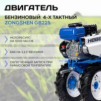 Мотоблок оснащен бензиновым двигателем Zongshen GB225 — это четырехтактный, одноцилиндровый двигатель с воздушным охлаждением. Имеет конструкцию верхнего клапана (OHV) и чугунные гильзы, которые повышают надежность основных узлов. Мощность двигателя 7,5 л.с.