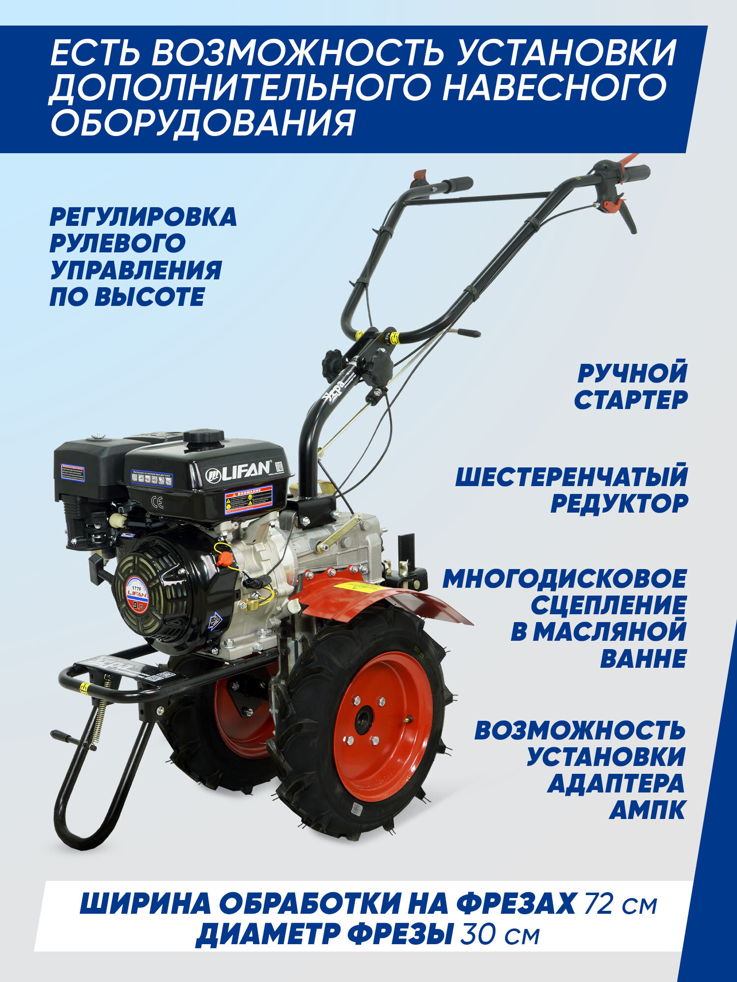 Мотоблок бензиновый угра НМБ-1Н14 (кадви) – представляет собой полноценный многофункциональный агрегат для выполнения сельскохозяйственных работ в огороде, на приусадебных участках и в фермерском хозяйстве. Мотоблок Угра имеет надёжное многодисковое сцепление в масляной ванне и два вала отбора мощности, это позволяет подключать широкую гамму дополнительных активных, навесных орудий, имеющих активный привод: полноприводный адаптер ампк, роторную косилку, снегоуборщик и другие. Наличие вала отбора мощности делает соединение активного навесного оборудования с мотоблоком надёжным и жёстким, что увеличивает передаваемый КПД. В качестве силового агрегата на мотоблоке используется четырехтактный бензиновый двигатель Lifan 177F с мощностью 9 л. с. Надёжный двигатель обеспечивает бесперебойную работу при интенсивном использовании, а установленный датчик уровня масла предотвращает повреждение двигателя при понижении уровня масла в картере ниже необходимого. Сельскохозяйственная машина угра НМБ-1Н14 имеет 3 передачи вперёд и 1 назад. Рулевая колонка регулируется по высоте, для удобства оператора. Бампер мотоблока оснащён подножкой. Мотоблок «Угра» соответствует европейским нормам безопасности: система управления позволяет мгновенно и безопасно остановить агрегат. Совместимые сцепки для установки пассивного навесного оборудования: - Сцепка поворотная Н МБ16.3Р250П подъемная ВРМЗ 01.06.40.00.00 КОД товара: 3458971585 Для расширения функционала, к мотоблоку можно установить дополнительное активное и пассивное навесное оборудование, к примеру: Косилка роторная навесная кадви "Заря" (КОД товара: 3489816358); плуг; окучник; картофелевыкапыватель. Дополнительный технические характеристики: Двигатель – карбюраторный с воздушным охлаждением, одноцилиндровый Тип запуска – ручной старт Объём топливного бака – 6 л. Редуктор – шестеренчатый Сцепление – многодисковое в масляной ванне Фрезы в комплекте – всего 16 ножей Диаметр фрез – 360 мм. Ширина обработки - 570-720 мм. Колеса пневматические - 4.00х10 «Ёлочка» Объём масла в картере двигателя – 1,1 л. Моторное масло, тип – SAE 30, SAE 15W40, SAE 10W40 Трансмиссионное масло – SAE 80W90 Размеры упаковки - 940х670х1113 мм. (ДхШхВ) Артикул производителя - НМБ.000.000.0-28