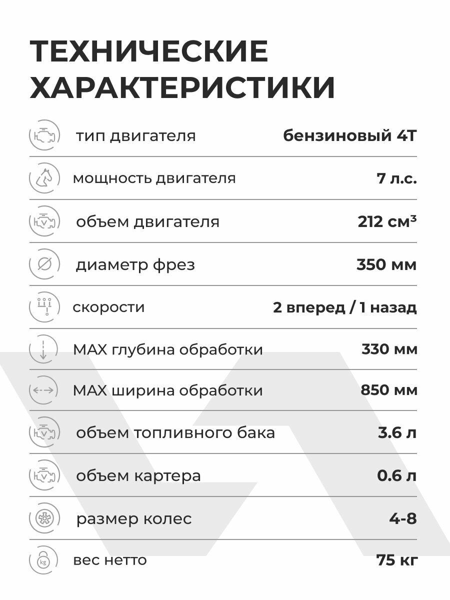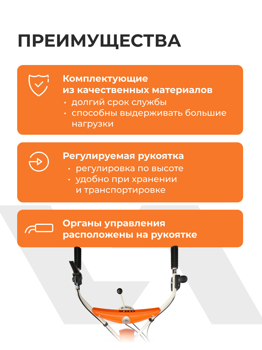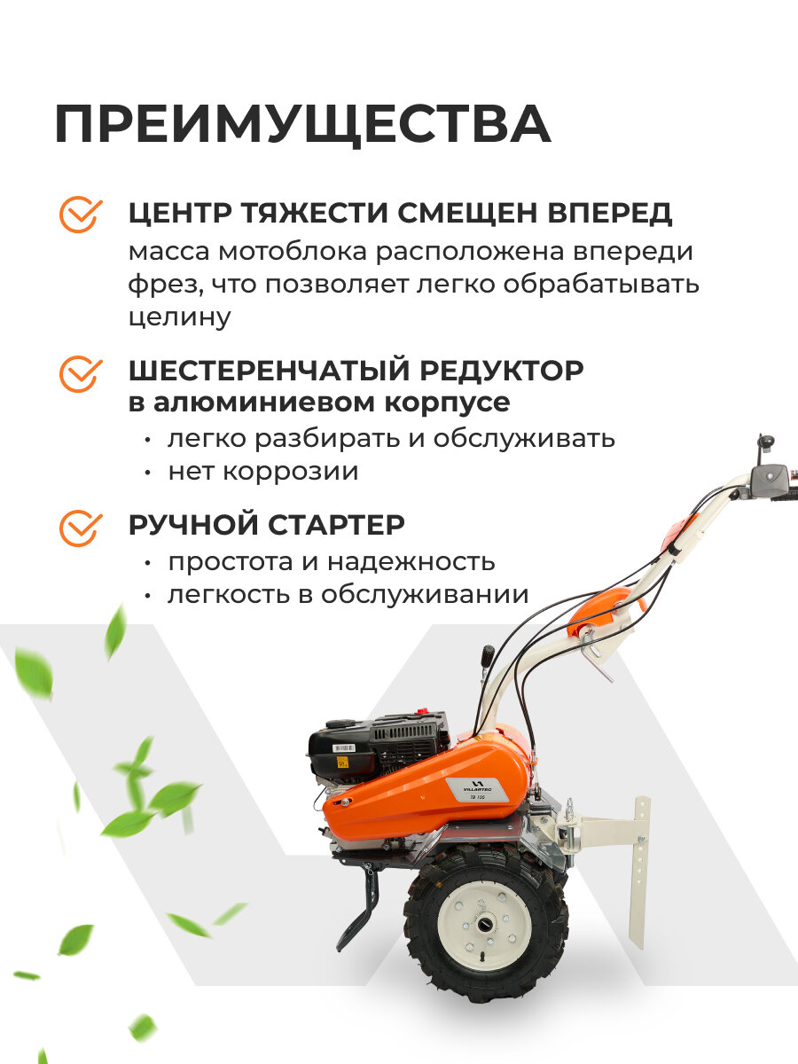 | Подробная комплектация | Мотоблок; Комплект для фрез; Инструмент для сборки; Инструкция; Упаковка |