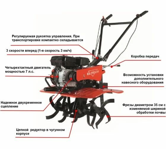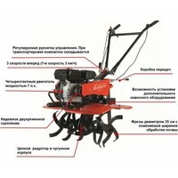| Оснастка | грунтозацепы, картофелекопалка, косилка, окучник, плуг, прицеп/тележка, фрезы |