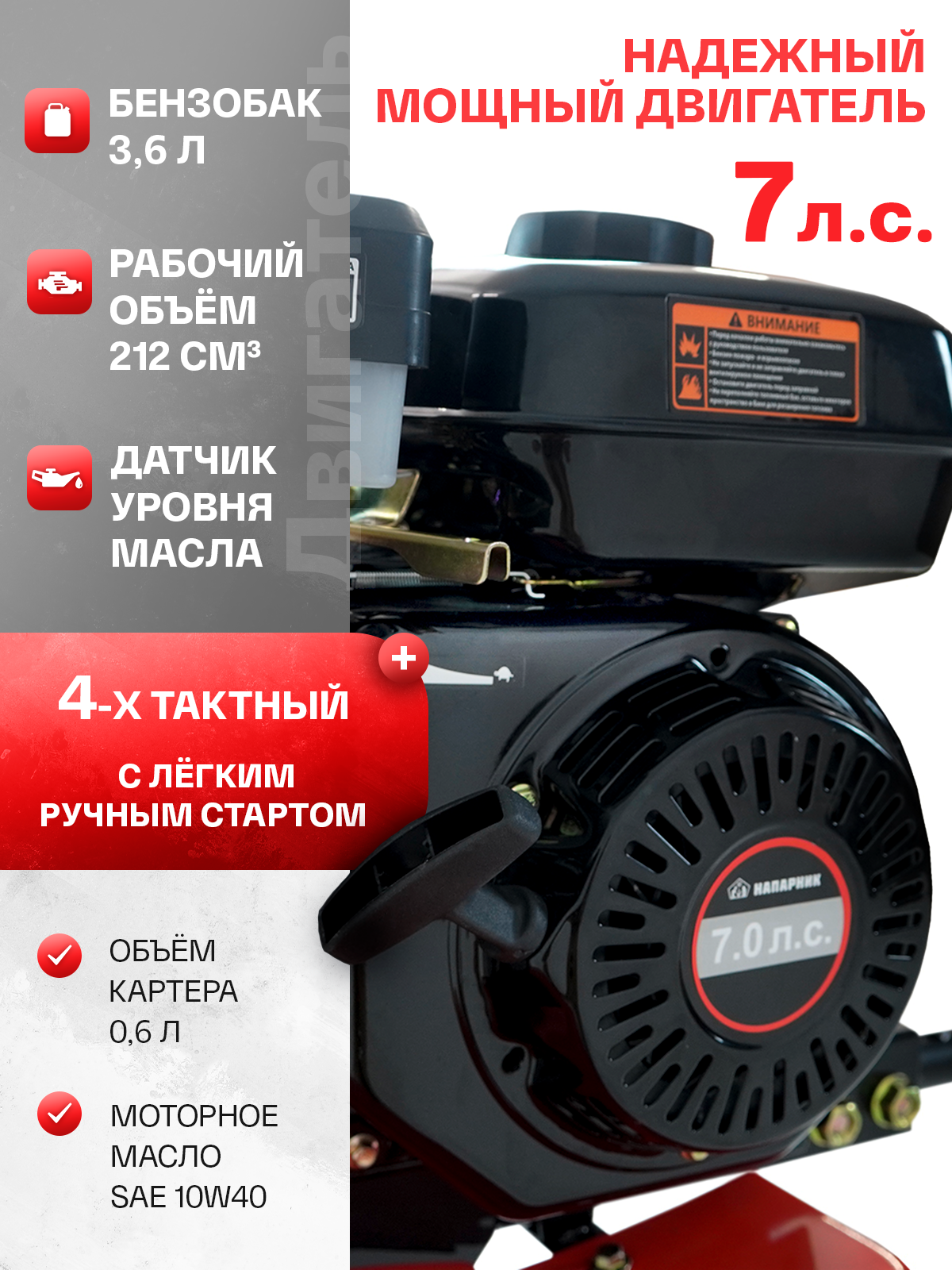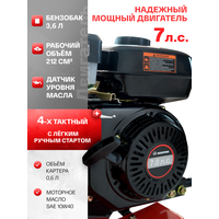 используется четырехтактный бензиновый двигатель Напарник 170F с мощностью 7 л. с. Надёжный двигатель обеспечивает бесперебойную работу при интенсивном использовании, а установленный датчик уровня масла предотвращает повреждение двигателя при понижении уровня масла в картере ниже необходимого.