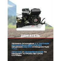 Техника оснащена 4-х тактным бензиновым двигателем объёмом 206 см3 и мощностью 7 л. с. Запуск производится с помошью ручного стартера.