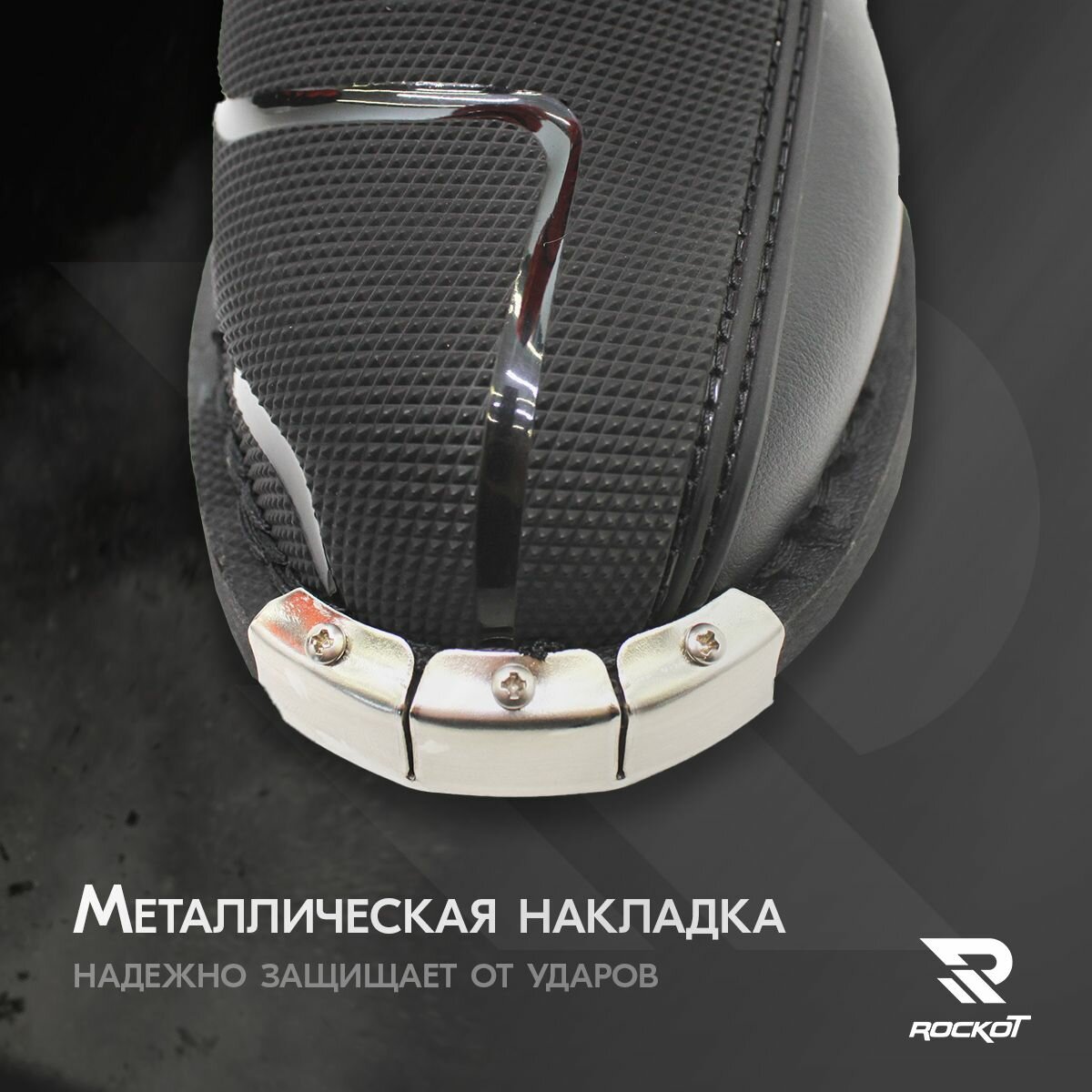 Металлические накладки на “носках” ботинок защитят пальцы ног, а также продлят срок службы мотообуви.