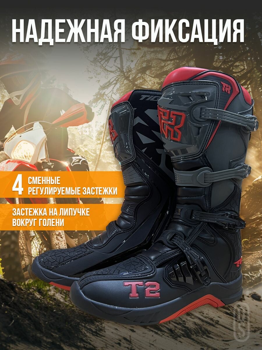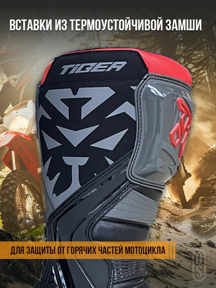 Предназначены для езды на эндуро мотоцикле по бездорожью, имеют специальную подошву и защитные вставки для предотвращения получения ожогов от мотоцикла. Эти мотоботы Tiger в красно-серо-черном цвете будут отлично сочетаться с другой кроссовой экипировкой (эндуро), а также с вашим мотоциклом, обеспечивая при этом высочайшую защиту вашей стопы и голени во время езды на кроссовом мотоцикле по бездорожью, в том числе при катании в лесу, по песку и по дорогам. Эти кроссовые мотоботинки также будут удобны для эксплуатации на квадроцикле, дорожном мотоцикле и других видах транспорта, где требуется ботинки с высокой степенью защиты.
