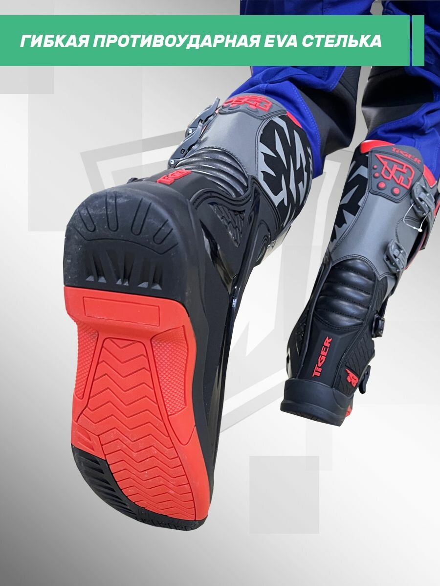 Предназначены для езды на эндуро мотоцикле по бездорожью, имеют специальную подошву и защитные вставки для предотвращения получения ожогов от мотоцикла. Эти мотоботы Tiger в красно-серо-черном цвете будут отлично сочетаться с другой кроссовой экипировкой (эндуро), а также с вашим мотоциклом, обеспечивая при этом высочайшую защиту вашей стопы и голени во время езды на кроссовом мотоцикле по бездорожью, в том числе при катании в лесу, по песку и по дорогам. Эти кроссовые мотоботинки также будут удобны для эксплуатации на квадроцикле, дорожном мотоцикле и других видах транспорта, где требуется ботинки с высокой степенью защиты.