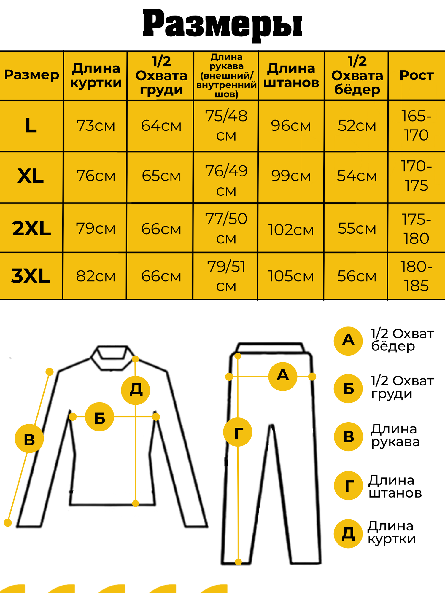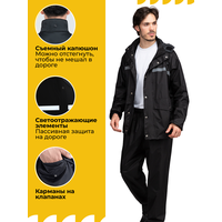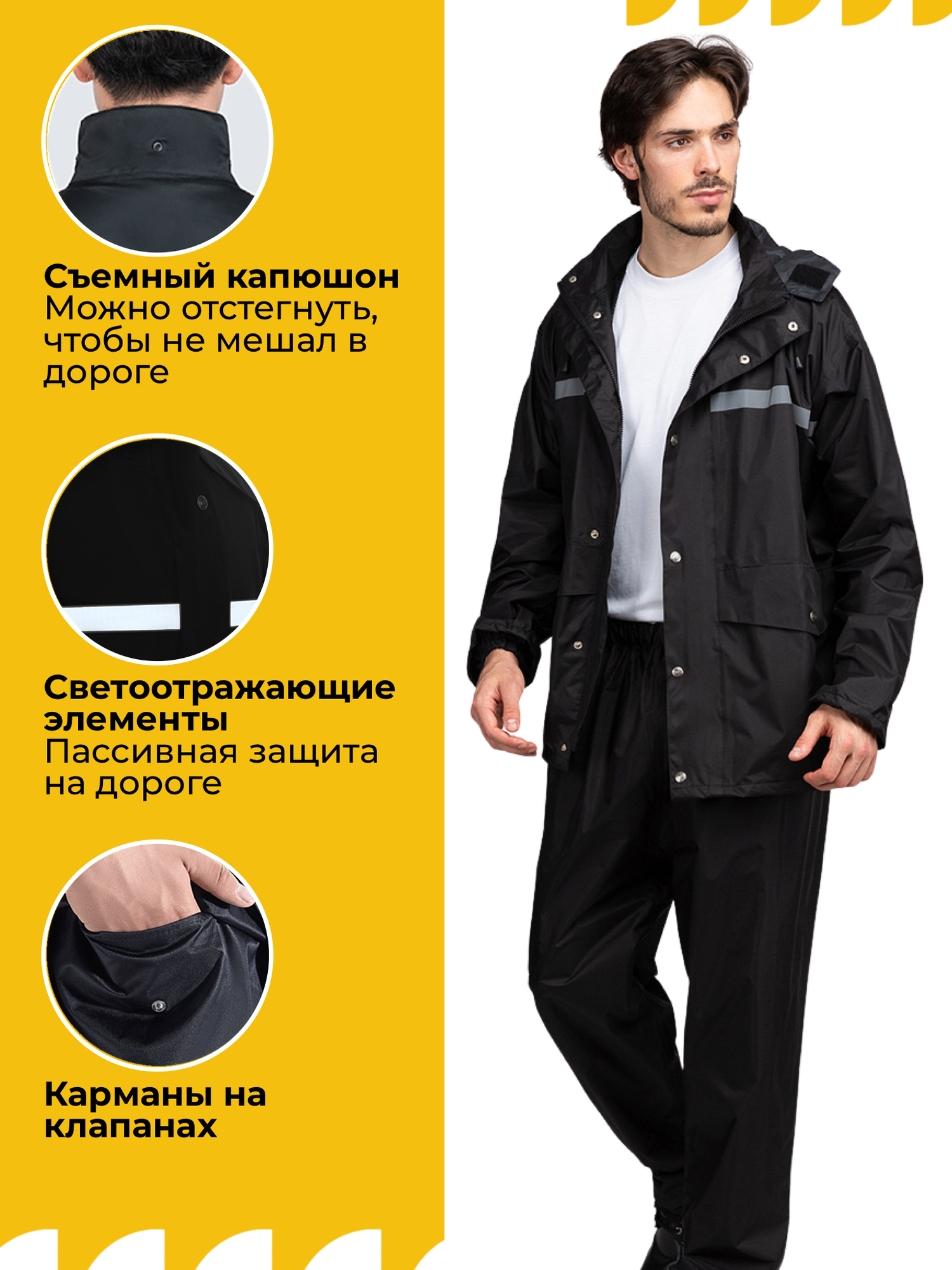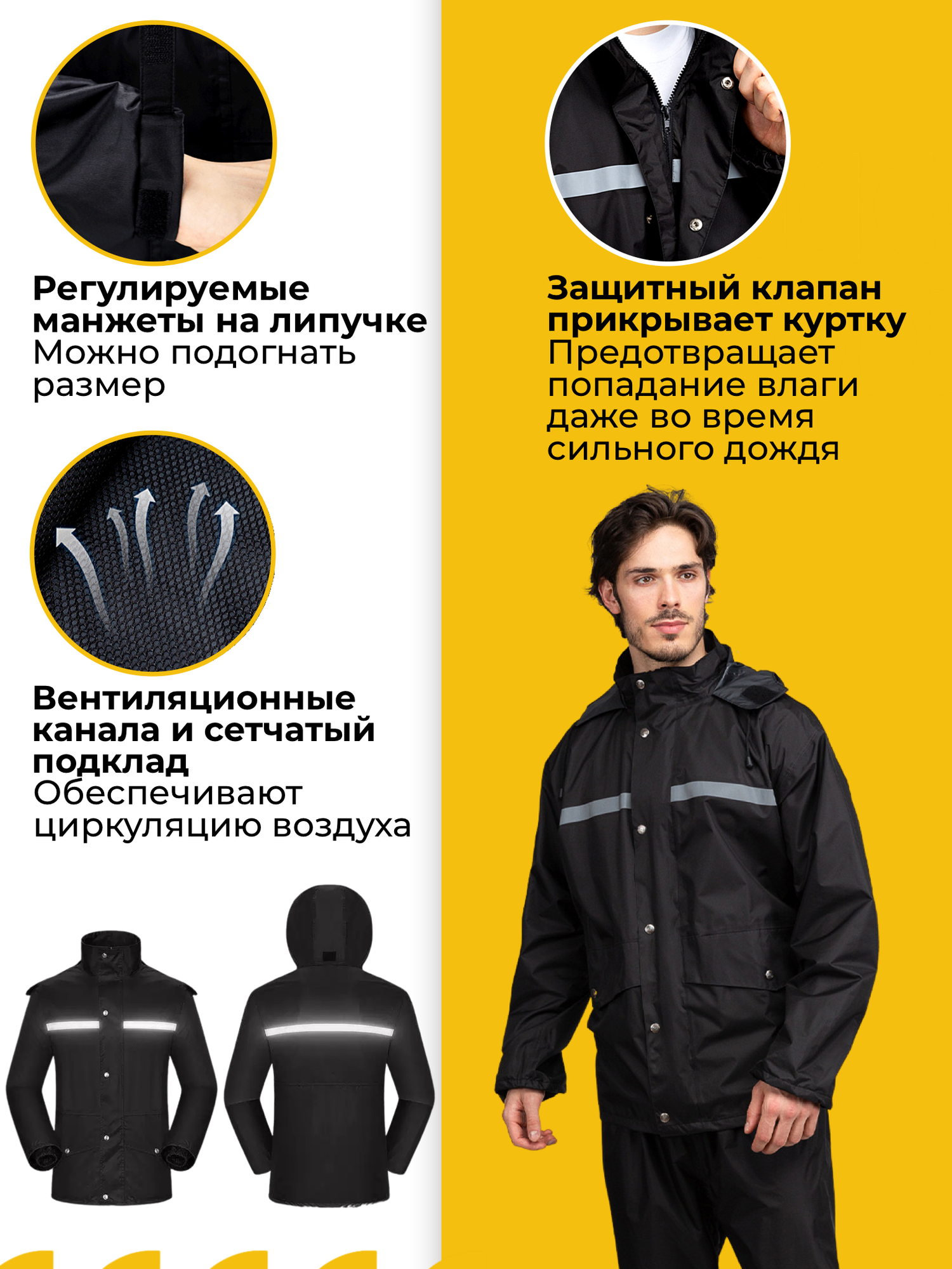 Костюм дождевик оснащен регулируемыми манжетами на липучке, что позволяет легко подогнать его под размер руки. Сетчатый подклад обеспечивает вентиляцию и комфорт во время носки.