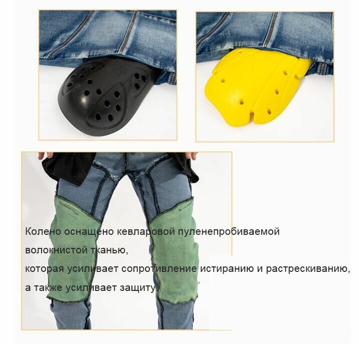 Колени мотоциклетных джинсов оснащены пуленепробиваемой тканью из кевларового волокна, которая усиливает износостойкость и устойчивость к растрескиванию, а также усиливает защиту. Мотоциклетные джинсы просто необходимы любителям мотокросса и верховой езды! Они сочетают в себе стиль и функциональность, обеспечивая комфорт и безопасность во время активного вождения! Однотонные модные байкерские джинсы, предназначенные для автоспорта, популярны среди мужчин всех возрастов! Они доступны в синем и черном цветах, чтобы соответствовать вашему стилю. Байкерские штаны с защитной набивкой для дополнительной безопасности во время езды. Эти вставки стратегически расположены для защиты ног и бедер от возможных травм. Посадка брюк улучшена для комфорта и свободы движений. Это особенно важно при активной езде на мотоцикле или велосипеде, когда нужно быть готовым маневрировать и быстро переключать передачи. Штаны с ветрозащитными свойствами также являются важным элементом мотоциклетной экипировки. Они блокируют холодный ветер и согревают вас в дороге. Джинсы для велогонок предназначены для профессиональных гонщиков и любителей. Они имеют особые характеристики, учитывающие требования скоростной езды. Выбор правильного мотоциклетного снаряжения, в том числе мотоциклетных джинсов, является важным аспектом безопасности и надежности мотоцикла. При выборе джинсов для езды на мотоцикле особое внимание следует уделить качеству материала, характеристикам защиты и удобству ношения,