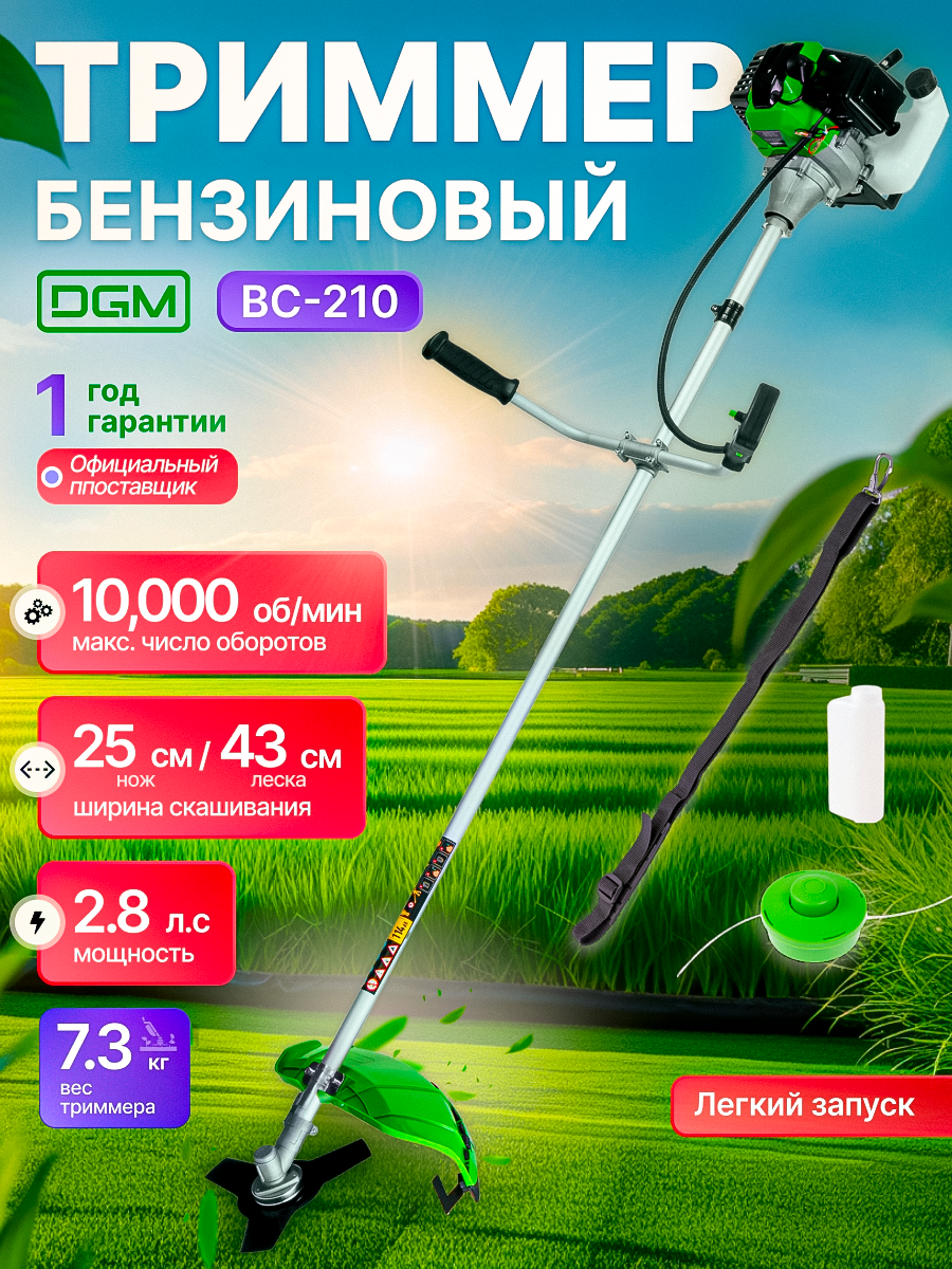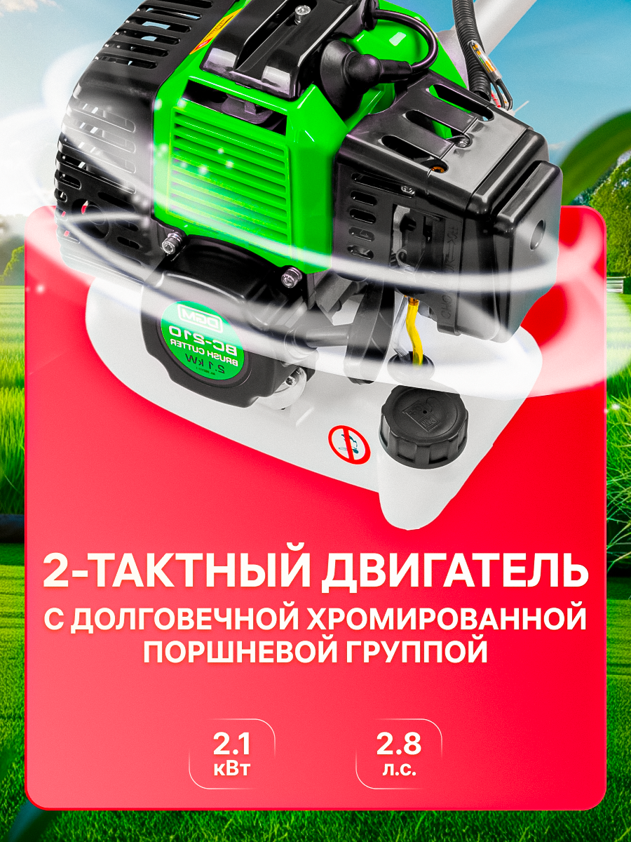 | Подробная комплектация | Двигатель двухтактный бензиновый; Вал мотокосы с трубой; Триммерная катушка (полуавтоматическая); Нож трёхлопастной; Кожух защитный с винтами крепления; Ремень плечевой; Комплект регулировочных инструментов и принадлежностей; Дозатор топливной смеси; Ручка левая; Ручка правая; Упаковка; Руководство по эксплуатации |