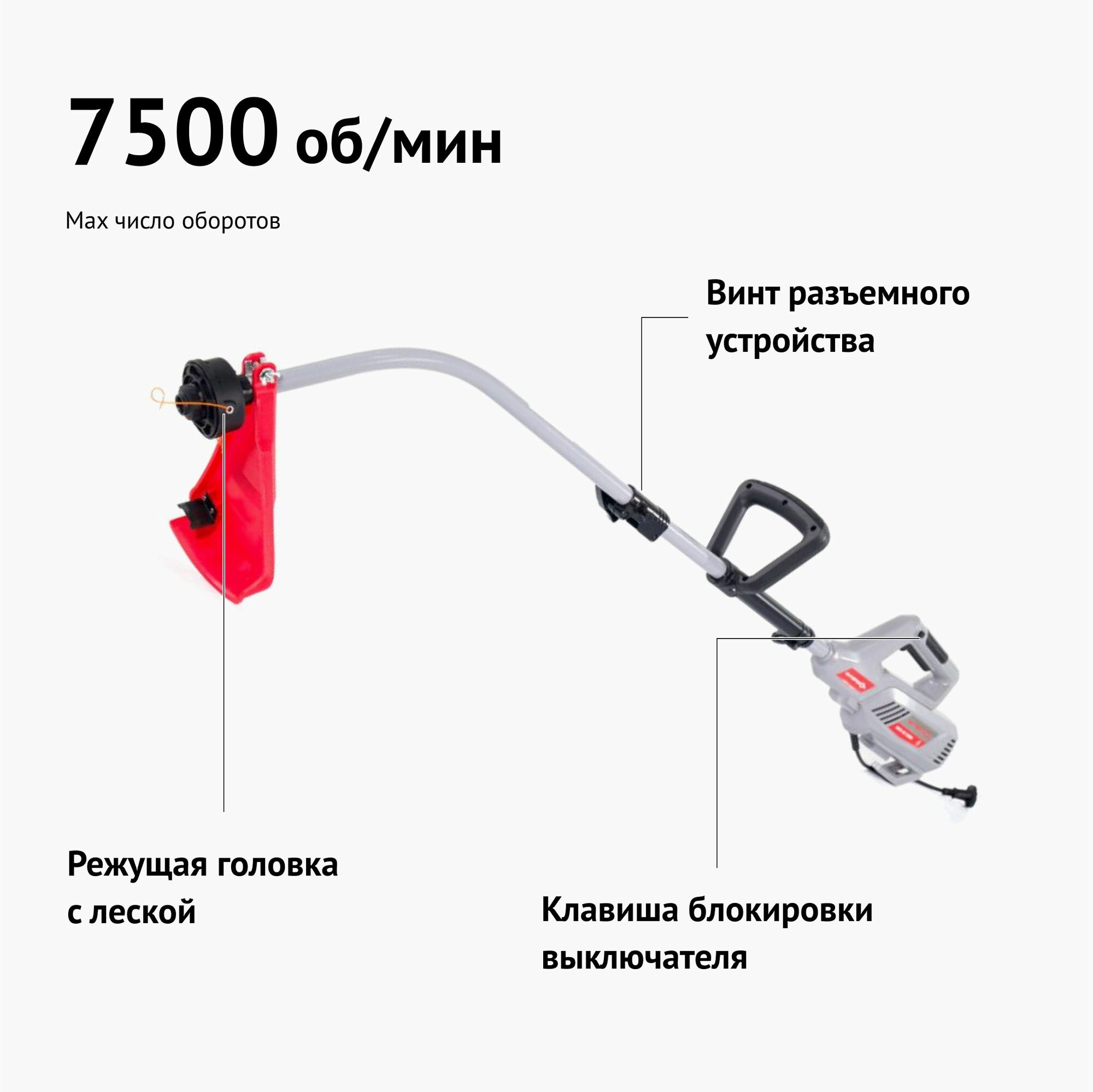 Электрокоса -1 шт.Руководство по эксплуатации и Инструкция по безопасности -1 шт.Гарантийный талон -1 шт.Вспомогательная D-образная рукоятка -1 шт.Головка режущая с леской -1 шт.Кожух защитный -1 шт.Ремень плечевой -1 шт.Набор инструмента для сборки и обслуживания -1 шт.Упаковка картонная -1 шт.