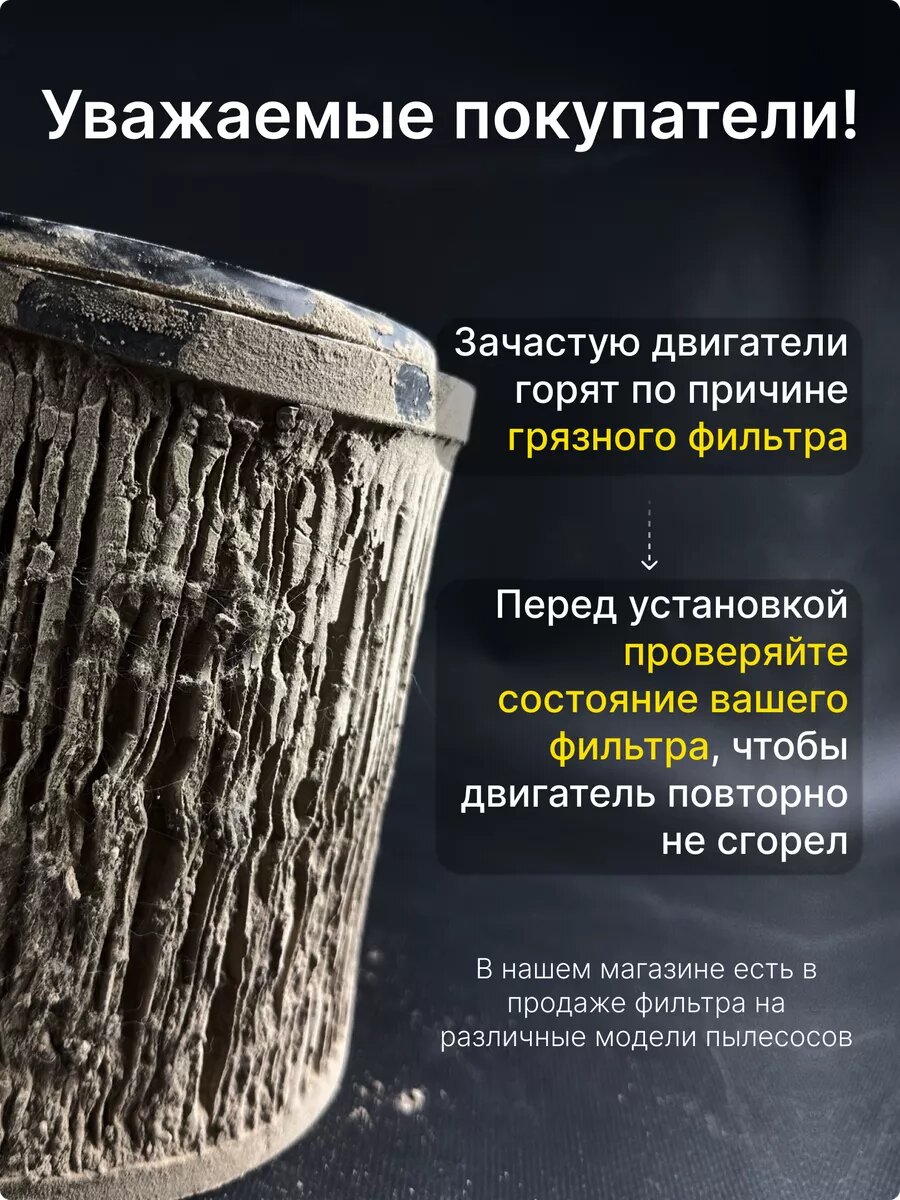 Двигатель для пылесосов ЭлДжи (LG). Бесплатный подбор по модели Вашего пылесоса нашим менеджером. Напишите в раздел вопросы к товару название модели Вашего пылесоса и менеджер подберет подходящий двигатель. Мощность 1400Вт, можно установить вместо 1600Вт, посадочные размеры одинаковые. Мотор требует замены, если на нём гудят подшипники якоря и крыльчатка и щётки двигателя (искрит), сгорела обмотка, не ломается регулятор оборотов а не сам двигатель. Ремонт практически не продлевает срок службы. Рекомендуется также менять моторный фильтр. Совместимость: Мотор подходит к большинству моделей LG: V-C4265HTV V-C4266HEU V-C7141NTR V-C7142NT V-C7143HTR V-C7145HT V-C7155HEU V-C7251NT V-C7251NTB V-C7252HT V-C7261NT V-C7262HT V-C7263HTQ V-C7263HTQB V-C7263NT V-C7264HEU V-C7265NTU V-C7270HTR V-C7271HTU V-C7461NTR V-C7462HE V-C7463HTU V-C7A51HTU V-C7A52HTV V-C7A53HT V-K8161HT V-K8161HTU V-K8162HTU V-K8163HE V-K8164HE V-K8171HTU V-K8174HE VSC7153HTV VSC7155HEU. Внимание! Представлены не все модели. Для того, чтобы подобрать под вашу модель пылесоса, задайте вопрос и наш менеджер подберет подходящий двигатель.
