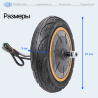 Изготовленное из металла и резины, мотор-колесо SpareLine обладает высокой прочностью и долговечностью. Диаметр колеса составляет 254 мм, а размер колес – 10 дюймов, что обеспечивает отличное сцепление с дорогой и стабильность на различных поверхностях.