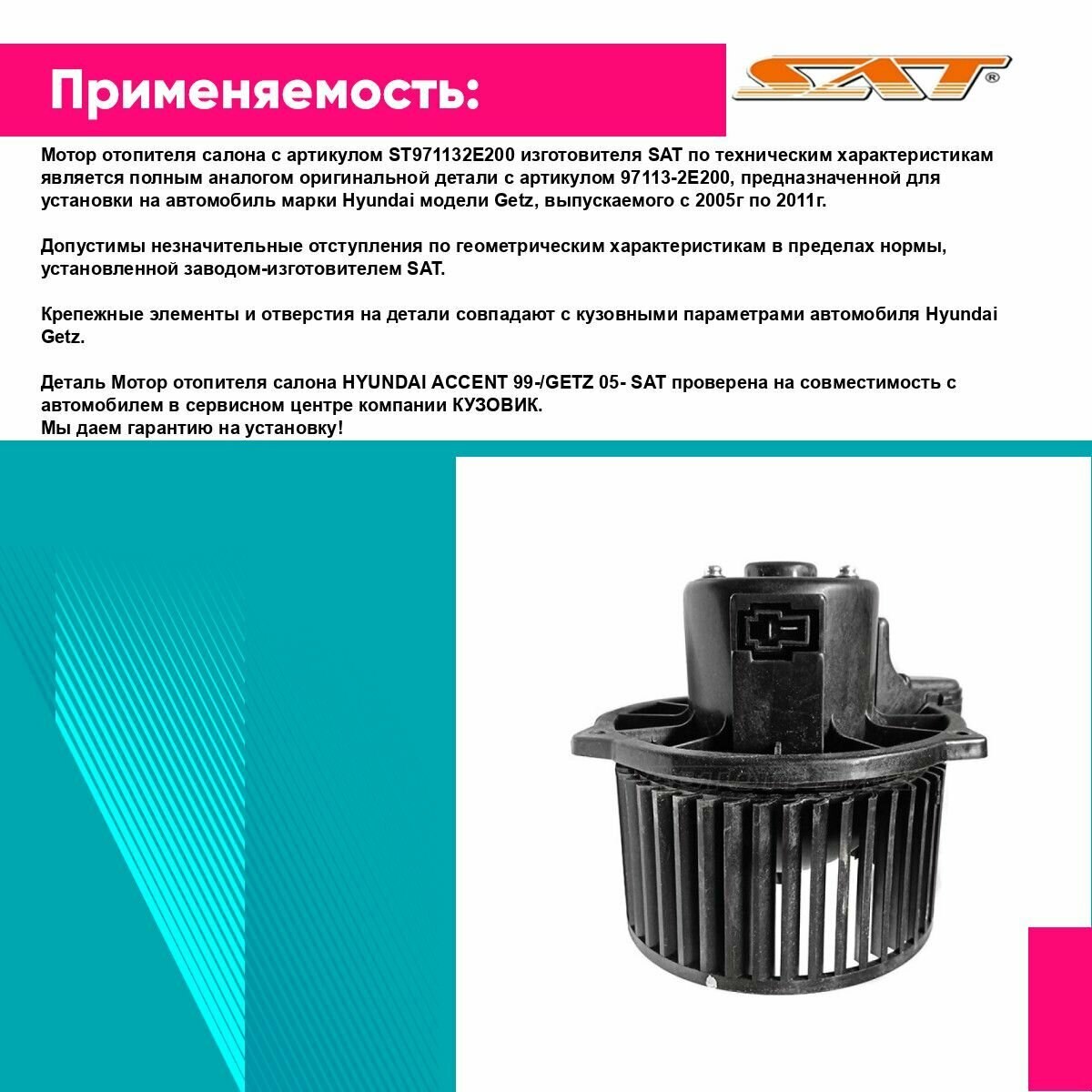 Мотор отопителя салона HYUNDAI ACCENT 99-/GETZ 05- SAT хендай гетц: сравнение цен, характеристики, фото, актуальное наличие и цены.