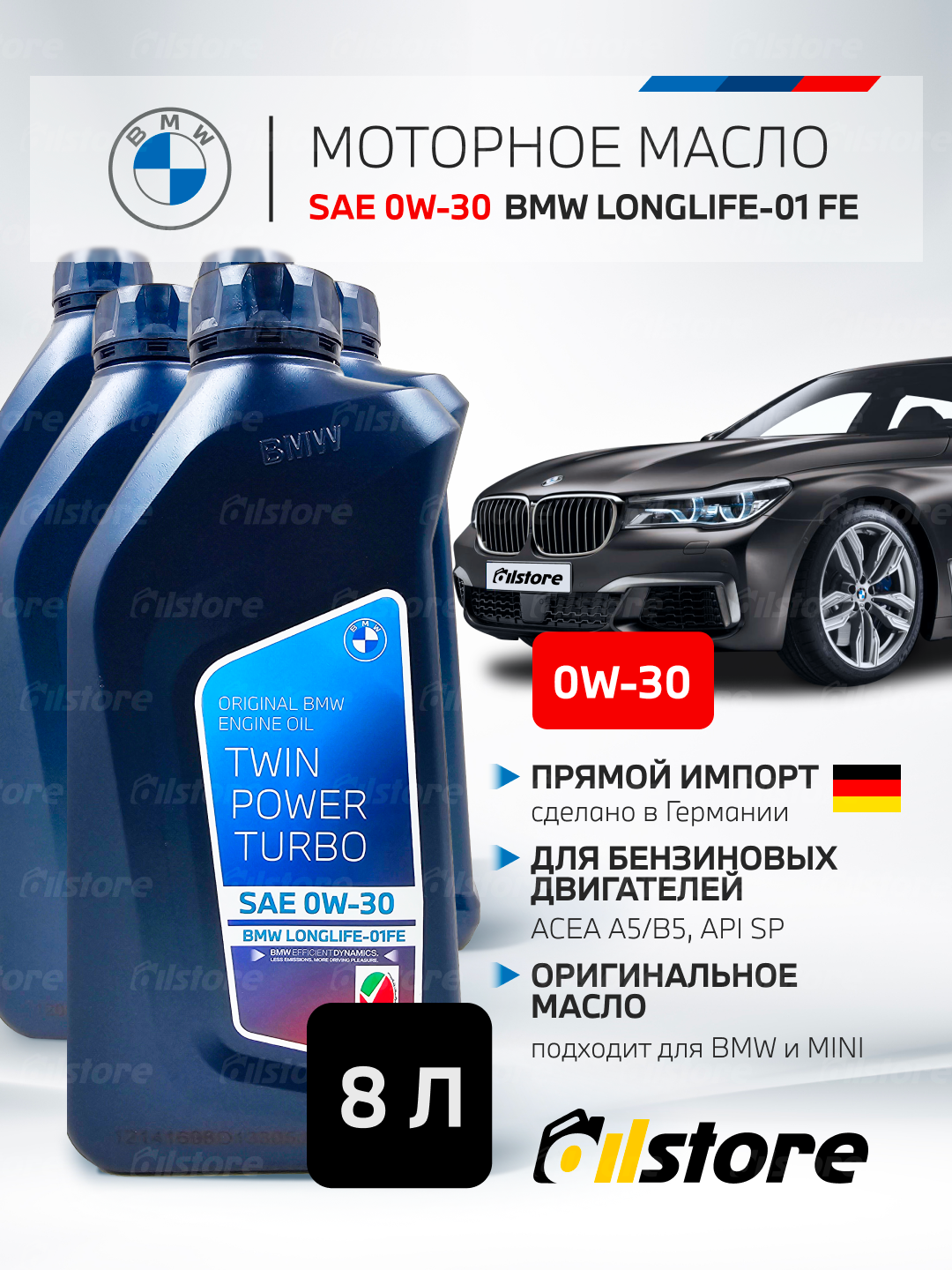 BMW TwinPower Turbo Longlife-01 FE 0W-30 - полностью синтетическое моторное масло, произведенное на основе технологии газожидкостной конверсии GTL. Специально разработано, произведено и испытано для того, чтобы полностью раскрыть потенциал двигателей BMW, обеспечивая их более высокие эксплуатационные характеристики и защиту. По сравнению со стандартными продуктами моторное масло BMW Longlife-01 FE 0W-30 обеспечивает улучшенную топливную экономичность, что в полной мере позволяет двигателям BMW реализовывать возможности технологий EfficientDynamics.