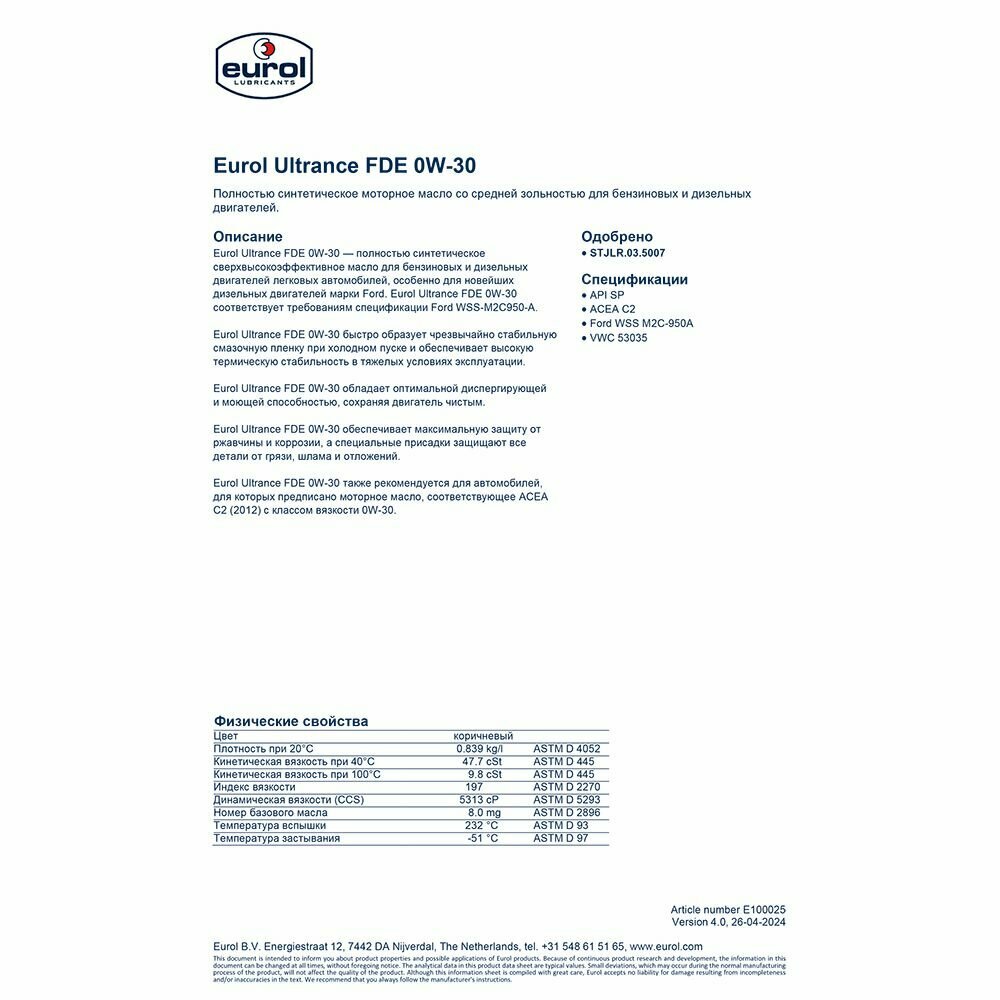 Моторное масло Eurol Ultrance FDE 0W-30 5л, синтетика,: сравнение цен, характеристики, фото, актуальное наличие и цены.