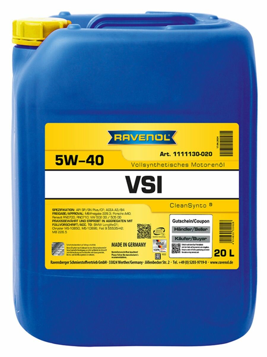 Моторное масло RAVENOL VSI 5W-40, 20 литров: сравнение цен, характеристики, фото, актуальное наличие и цены.