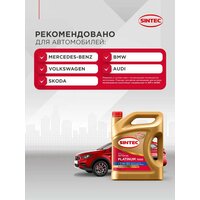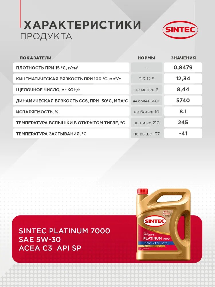 Масло моторное синтетическое «SINTEC PLATINUM SAE 5W-30 API SP, ACEA C2/C3» производится из высококачественных синтетических базовых масел и передового многофункционального пакета присадок. Обеспечивает защиту от низкоскоростного предварительного зажигания (LSPI), явления которое встречается в двигателях с турбонаддувом и прямым впрыском топлива. Совместимо с системами нейтрализации отработанных газов. Отвечает современным требованиям по обеспечению топливной экономичности. Обеспечивает превосходную защиту двигателя от износа, увеличенный межсервисный интервал без образования отложений, а так же быстрый и лёгкий запуск двигателя при низких температурах. Применение: Предназначено для применения в самых современных бензиновых и дизельных двигателях, особенно оснащённых турбонаддувом и непосредственным впрыском топлива, где требуется топливная экономичность, защита от LSPI и наивысший уровень эксплуатационных свойств API SP. Подходит для применения в дизельных двигателях лёгких грузовиков. Стойкое к механической деструкции масло, совместимо с системами нейтрализации отработанных газов ДВС, оборудованных сажевыми фильтрами и трехкомпонентными катализаторами, увеличивают срок службы последних. рекомендовано там, где требуются смазочные материалы эксплуатационного класса ACEA C3/C2 или API SP (или более ранних спецификаций) и соответствующего класса вязкости SAE 5W-30 рекомендовано для применения в автомобилях марок Mercedes-Benz, где требуется масло эксплуатационного уровня MB 229.31 Одобрения и соответствия API SP ACEA C2/C3 MB-Approval 229.31