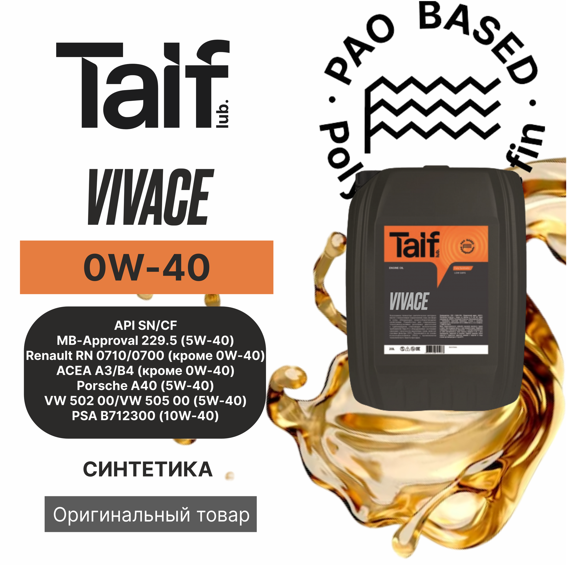 Купить Моторное масло TAIF VIVACE 0W-40 20L SN с доставкой по всей России. Моторное масло TAIF VIVACE 0W-40 20L SN: сравнение цен, характеристики, фото, актуальное наличие и цены.