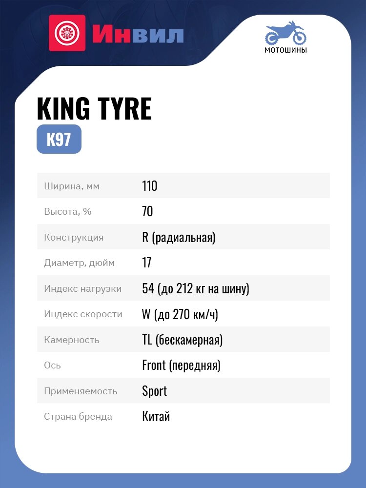 Купить Мотошина King Tyre K97 110/70 R17 54W TL Front с доставкой по всей России. Мотошина King Tyre K97 110/70 R17 54W TL Front: сравнение цен, характеристики, фото, актуальное наличие и цены.