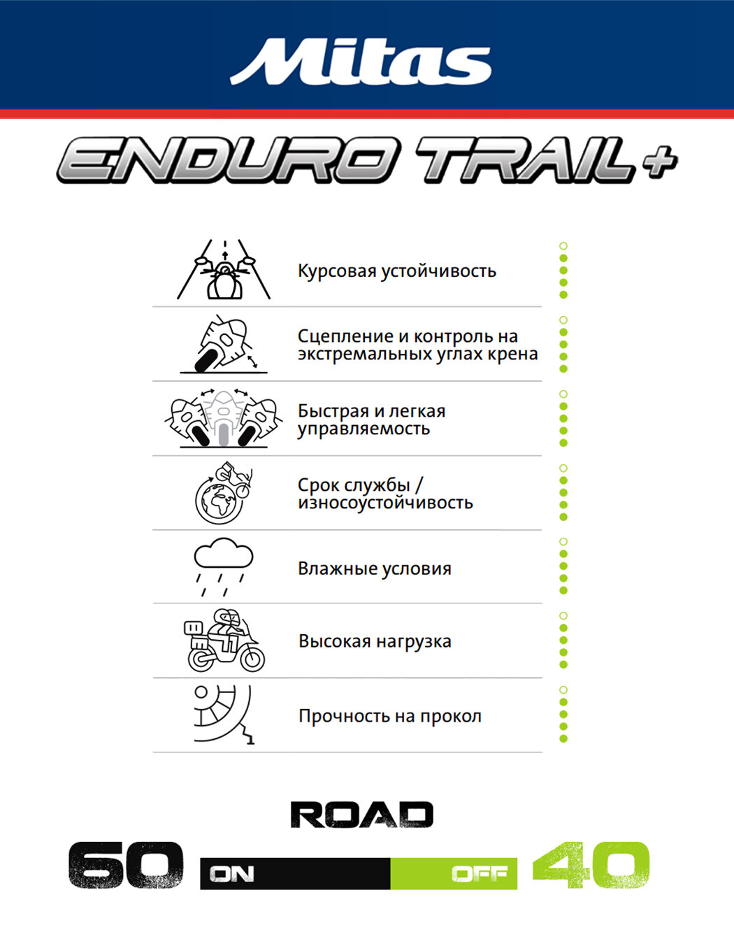 • Классифицирована M+S для использования на дорогах с твердым покрытием (60%) и гравийным дорогам (40%). Обеспечивает универсальные характеристики и уверенность на дорогах с любым типом покрытия.