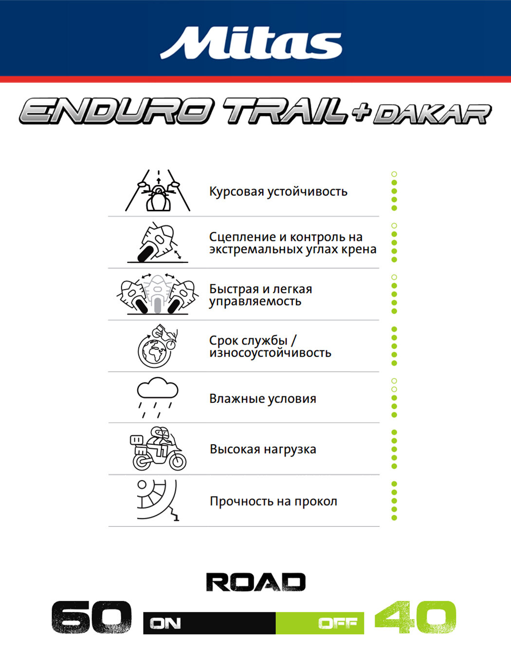 Агрессивный шевронный рисунок протектора с большими блоками обеспечивает превосходное сцепление, стабильность и устойчивость на поворотах даже во влажных условиях. Доступна в версии для тяжелых условий эксплуатации или в дополнительной версии для сверхтяжелых условий (DAKAR), рассчитанной на повышенный срок службы