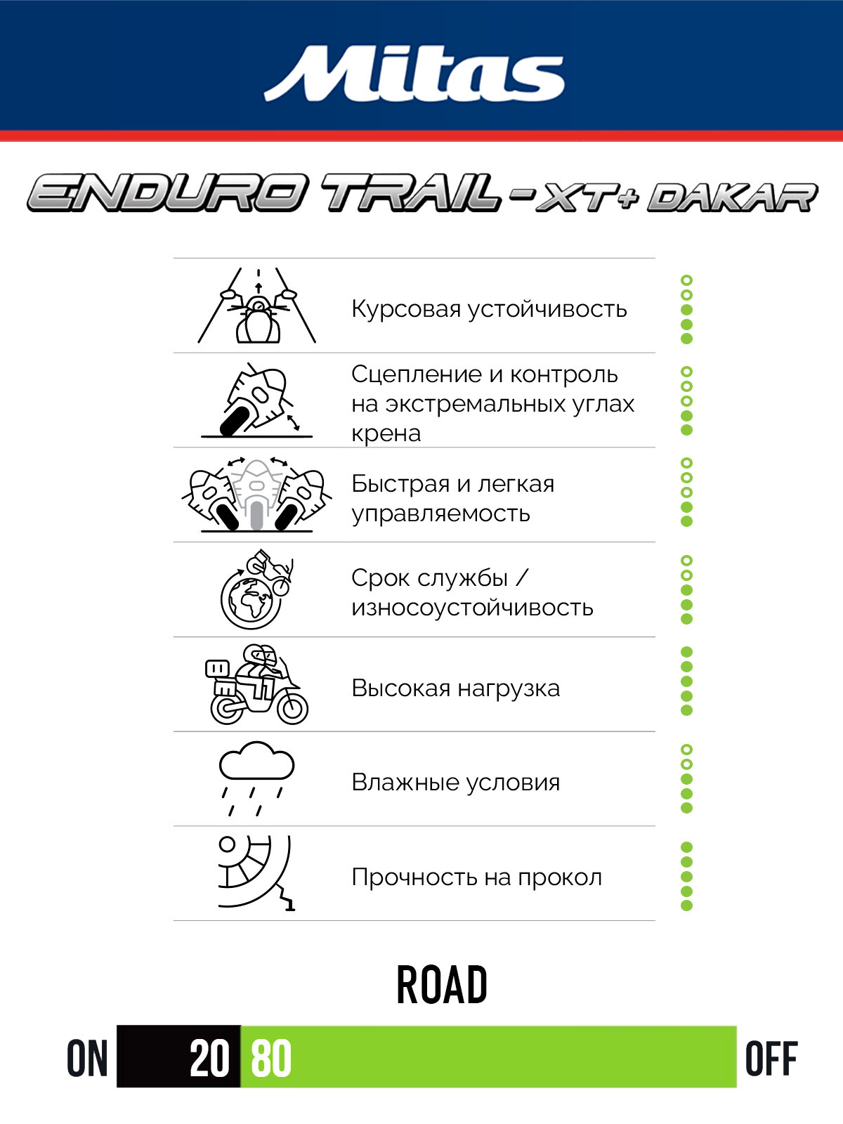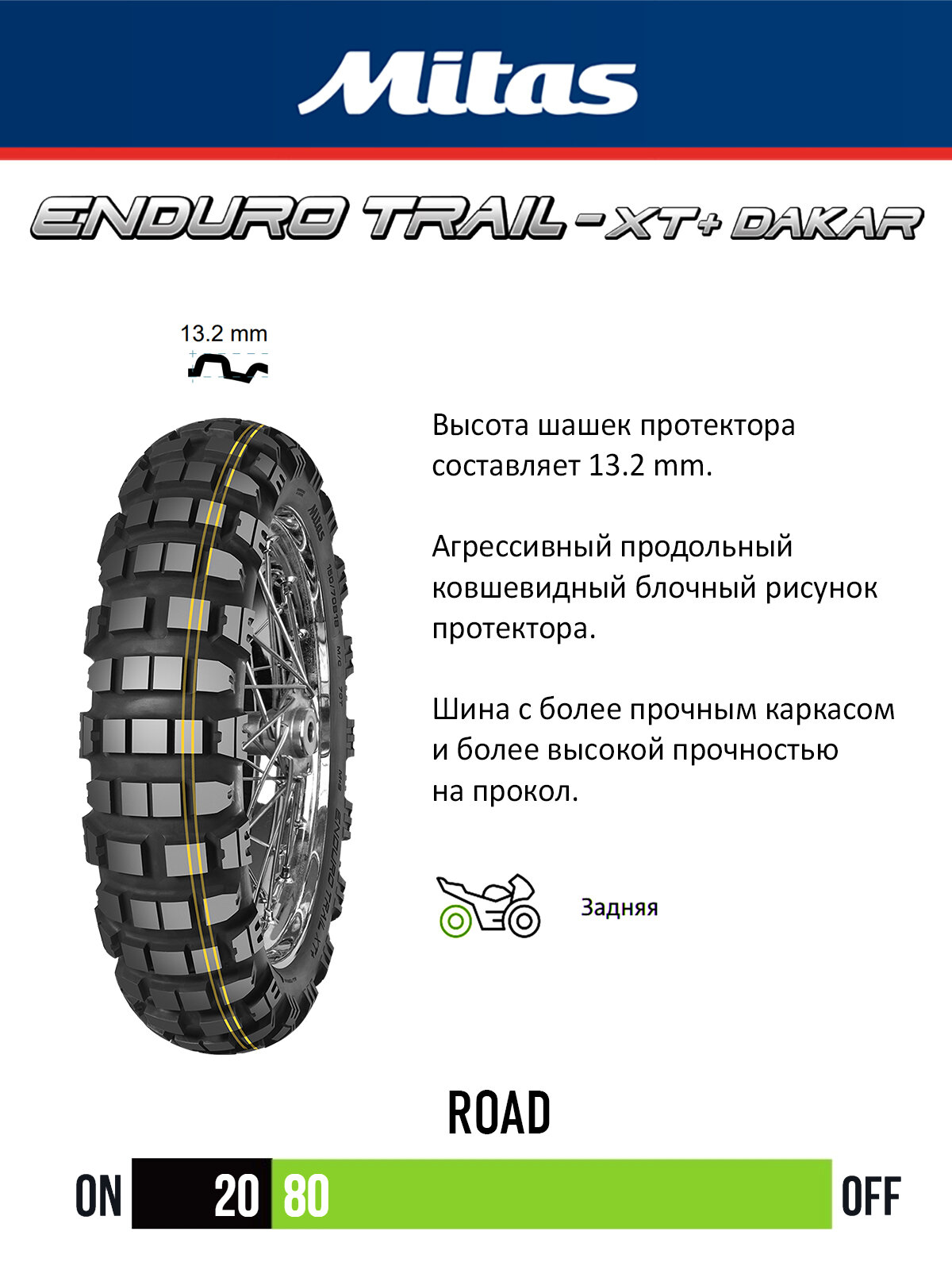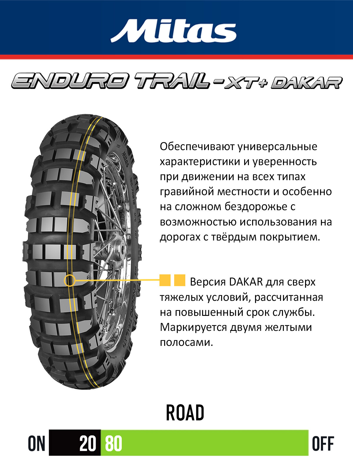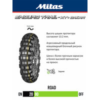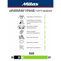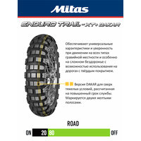 • Мотошины серии Mitas ENDURO TRAIL XT+ классифицированы как M+S с возможностью использования на дорогах с твёрдым покрытием и разработаны для обеспечения универсальных характеристик и уверенности на всех типах гравийной местности и особенно на сложном бездорожье.