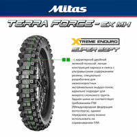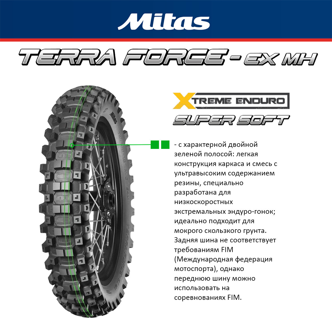Шины TERRA FORCE-EX MH (MH - Medium Hard Terrain) отличаются усовершенствованной конструкцией протектора, каркаса и профиля, с хорошо разнесенными высокими выступами агрессивной формы (~17 мм), которые способствуют отличному сцеплению с грунтом и управляемости на среднетвердом и твердом грунте, а боковые выступы с крючковатым профилем способствуют ускорению. Усиленный каркас и гибкая боковина помогают поглощать удары и обеспечивают максимальное сцепление и курсовую устойчивость.