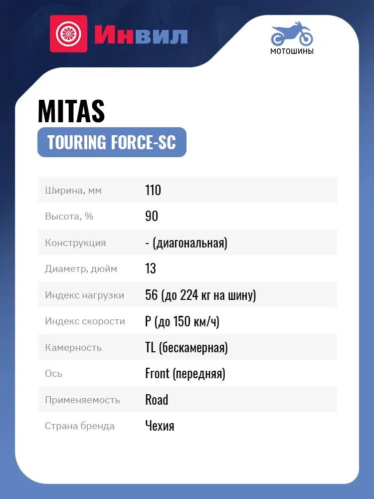 Купить Мотошина Mitas Touring Force-SC 110/90 -13 56P TL Front с доставкой по всей России. Мотошина Mitas Touring Force-SC 110/90 -13 56P TL Front: сравнение цен, характеристики, фото, актуальное наличие и цены.