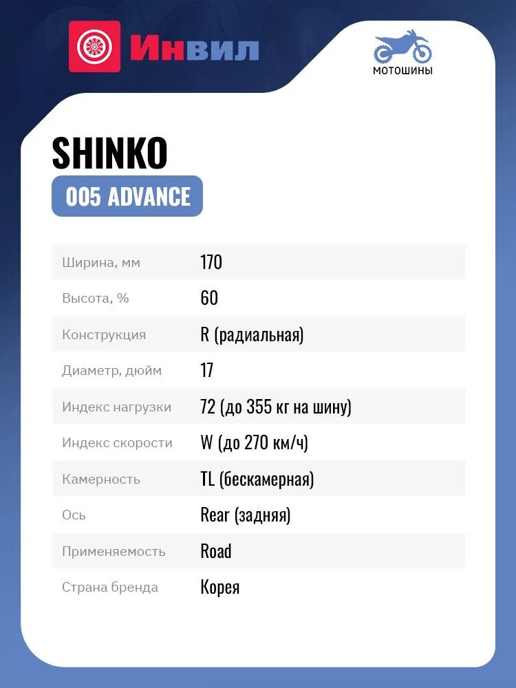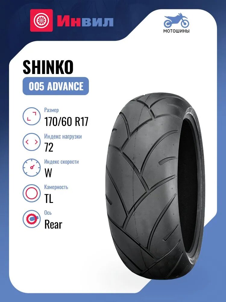Мотошина Shinko 005 Advance 170/60 R17 72W TL Rear: сравнение цен, характеристики, фото, актуальное наличие и цены.