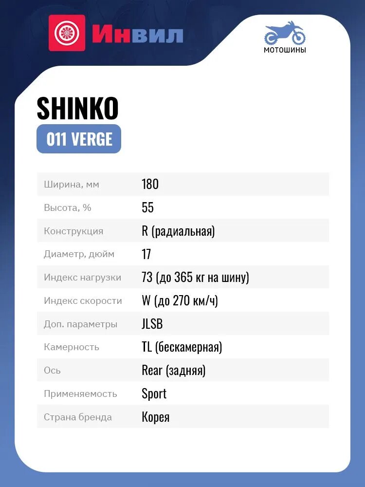 Мотошина Shinko 011 Verge 180/55 R17 73W JLSB TL Rear: сравнение цен, характеристики, фото, актуальное наличие и цены.