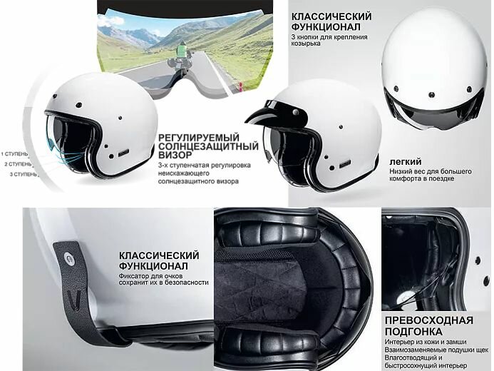 - Созданный из материала фиберглас, этот шлем обладает идеальным сочетанием комфорта, легкости и прочности. Регулируемый солнцезащитный визор с антифогом и тонировкой имеет 3 положения для оптимальной защиты от солнца в зависимости от вашего комфорта.