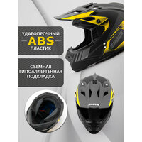 Качественный, доступный шлем для мотокросса и эндуро. Стандарт безопасности DOT! Материал корпуса шлема - термопластик. Система вентиляции из 9 воздушных воздухозаборных клапанов обеспечивает комфортную езду при любой погоде. Эргономичная форма корпуса обеспечивает хороший обзор, имеет широкий проем под маску. Канты для фиксации широкой резинки маски на задней части корпуса. Съемный, заменяемый козырек. Оснащен опорной площадкой для защиты шеи. Антигрязевой, сетчатый фильтр в районе основного воздушного клапана на подбородке. Съемный внутренний вкладыш из гипоалергенного материала, для сушки и стирки. Прочная и удобная в обращении микрометрическая застежка.
