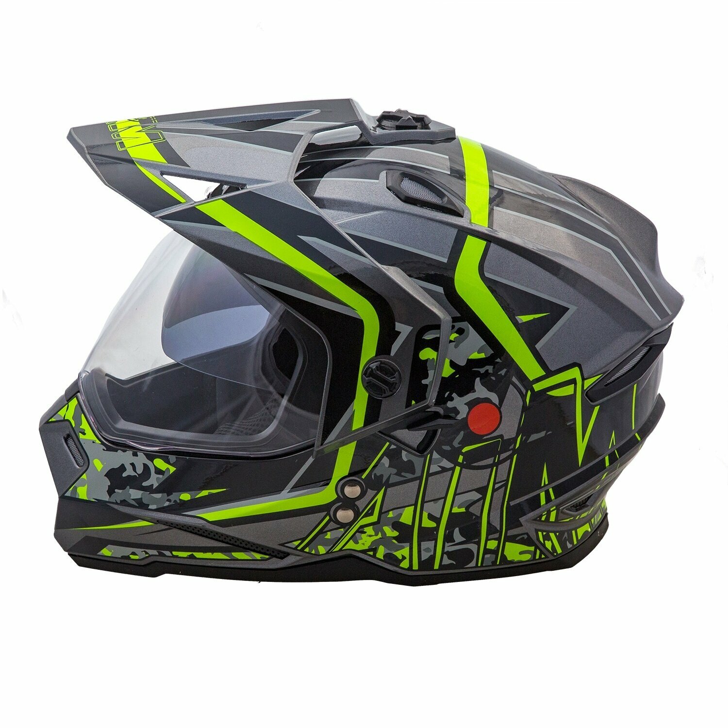 Материал скорлупы - термопластик Мотошлем комфортный и безопасный, двойного назначения Для езды на внедорожном мотоцикле, кроссовом или квадроцикле Современная форма наружной оболочки, классический дизайн Мотошлем возможно использовать как со стеклом, так и с кроссовыми очками Козырек регулируемый, съемный Шлем можно использовать как интеграл на трассе или в городе Стандартная система вентиляции отличный воздухообмен Отличный обзор Подкладка анатомической формы из мягкого гипоаллергенного материала Встроенный солнезащитный визор Сертификат безопасности - DOT