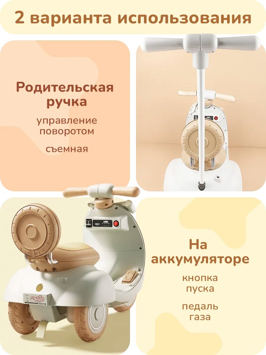 Электроскутер (скутер электрический) детский playokay — безопасность, стиль и удовольствие в каждом движении! Яркий бежево-белый дизайн детского мотоцикла привлечёт внимание, а мощный двигатель 380 Вт обеспечит плавное и уверенно движение. Одной заряженной батареи 6 В, 4,5 Ач хватит на долгие прогулки — идеально для малышей до 30 кг. Кнопка запуска и регулировка громкости делают управление простым и интуитивным, а мягкая подсветка добавит атмосферы даже в сумерках. Корпус из нетоксичного PP-пластика — безопасен для детей и выдержит любые приключения. Срок безопасной эксплуатации — 3 года. Пусть ваш ребёнок катается с улыбкой — и вы спокойно за него не переживаете.