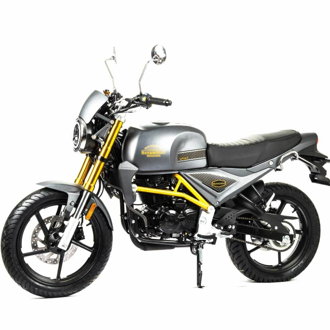 В мотоцикле MOTOLAND SCRAMBLER 250 установлен двигатель 165FMM, одноцилиндрового типа. В данной модели присутствует воздушное охлаждение. Стальная рама, объем топливного бака 9 литров. Расход топлива 3 л. на 100кмОдноцилиндровый четырехтактный двигатель 250сс 165FMM (CG250-B) с масляным радиатором. Система подачи топлива карбюратор. Трансмиссия механическая, пятиступенчатая. Подвеска передняя: Телескопическая вилка перевернутого типа. Подвеска задняя: моноамортизатор. Колесо переднее: 110/70-17. Колесо заднее: 140/70-17. Зеркала, крепление под номер, подножки второго пассажира. Тормоза дисковые. Очень удобное седло. Фара, электростартер, замок зажигания, АКБ, поворотники, стоп-сигнал, электронная приборная панель.