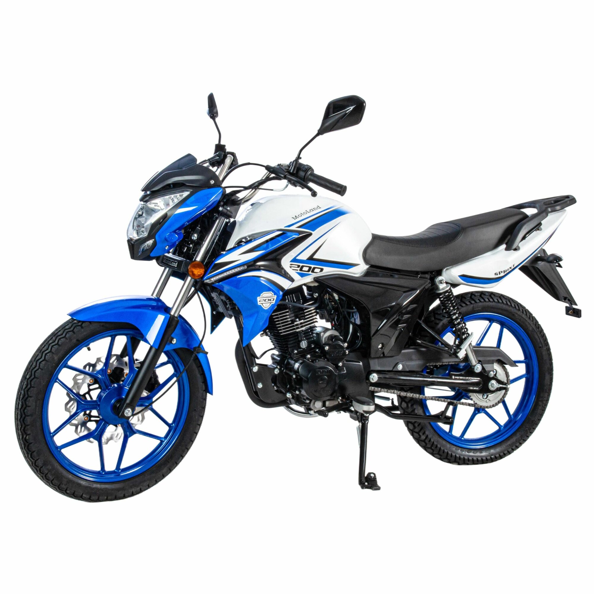 MOTOLAND SPRINT 200 - отличный вариант байка для тех, кто только решил приобщиться к мотокультуре и пересесть на двухколесную технику основательно, ведь он небольшого размера и легкий. Данный мотоцикл зачастую используется в автошколах для обучения учеников, ведь научиться водить на нем проще простого. Расход топлива 3,7л. на 100км. Мотоцикл оснащен бензиновым 200-кубовым двигателем 164FML с балансиром , карбюраторной системой питания PZ30. Охлаждается движок воздушным путем. Механическая коробка передач пятиступенчатая. Для запуска двигателя имеется как кикстартер, так и электростартер. Работа подвески мотоцикла организована на базе стандартных компонентов: передней телескопической вилки и двух задних амортизаторов. Размер колес 18/18. Колесные диски литые